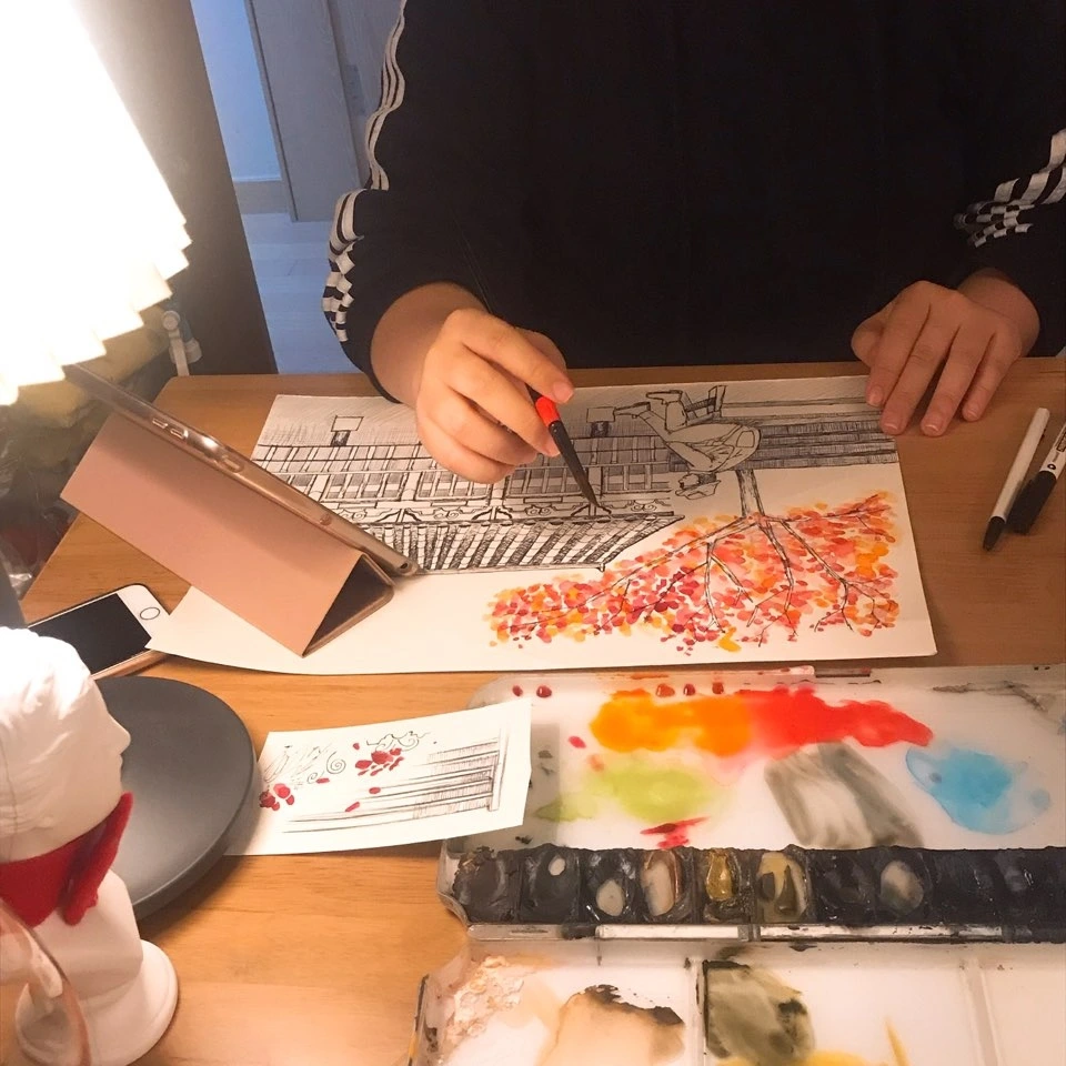 이전에 수채화 클래스가 마음에 들었던 터라, 계속 수업을 들어 보기로 했다. 앞서 말한 대로 여행 가서 펜으로 드로잉을 해보고 싶다고 하니 커리큘럼을 짜 주셨다. 이번엔 엄마와 지리산 단풍 구경 가서 찍은 사진에 도전했다.