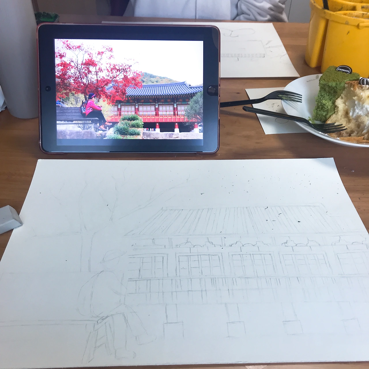 원근법과 구도는 하나도 모르기에 선생님 도움이 없었더라면 당당히 차원을 초월한 그림을 그려낼 뻔했다. 논의 끝에 사진에서 살릴 부분만 살리고, 어려운 사람과 뒷배경은 날려버리기로 했다. 그랬기에 그날 안에 완성을 할 수 있었던 것 같기도 하다.