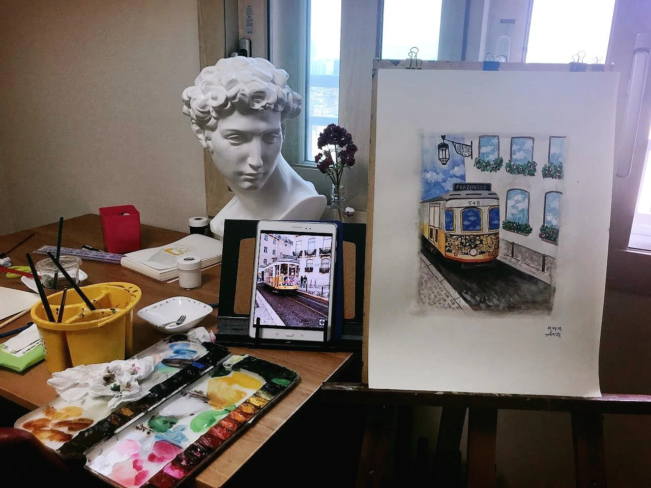 그려야 할 것이 정해져 있던 앞선 클래스들과는 달리, 이번엔 직접 그리고 싶은 여행 사진을 한 장 준비해 가야 했다. 별다른 고민 없이 내가 가장 사랑하는 곳, 리스본을 누비는 트램을 그리기로 했다. 고민을 좀 더 해 볼걸.