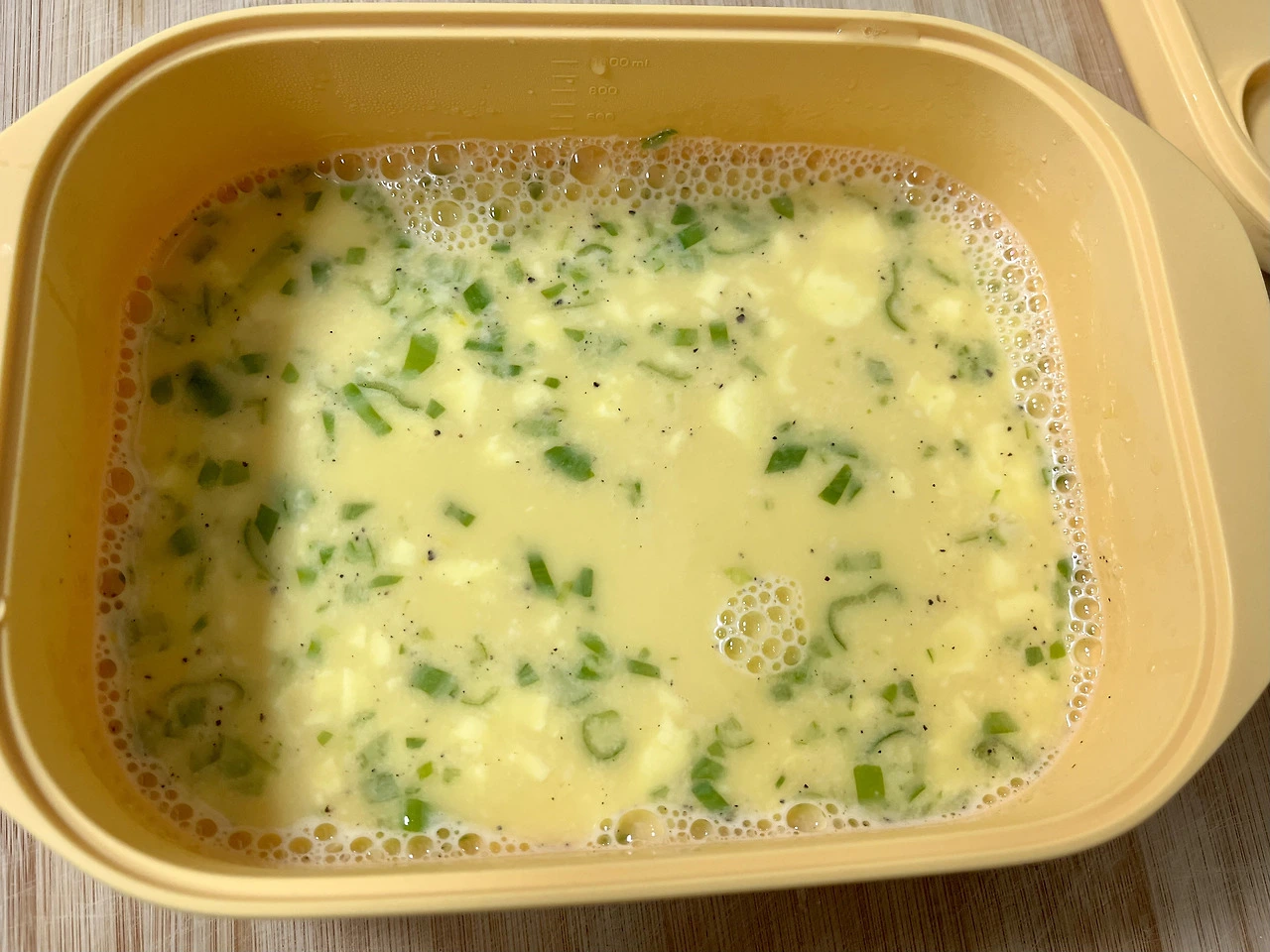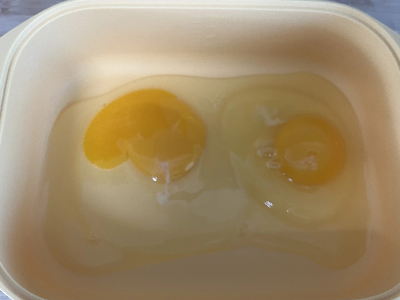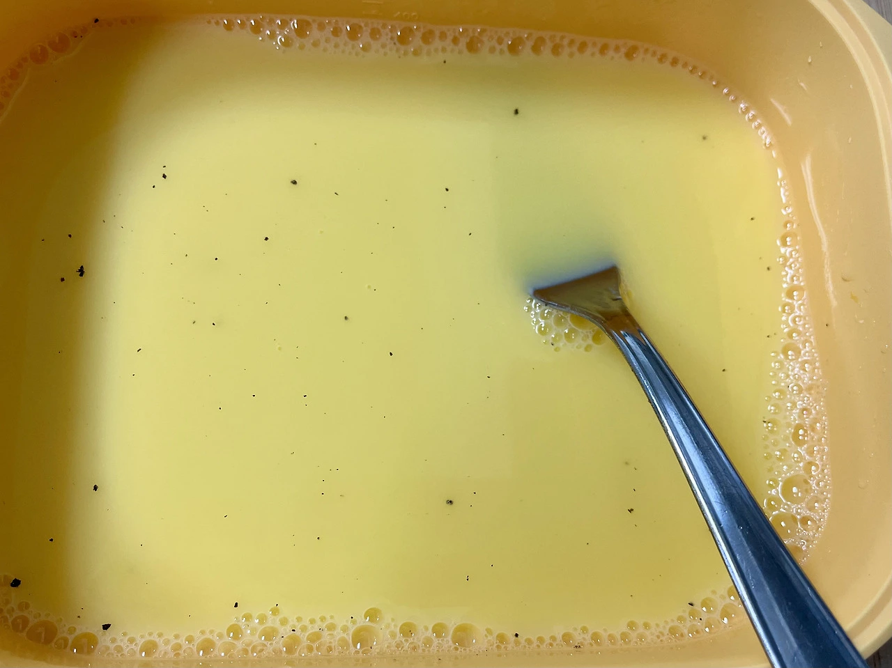 실리콘찜기에 계란 2개를 넣고 젓가락으로 천천히 풀어줘.