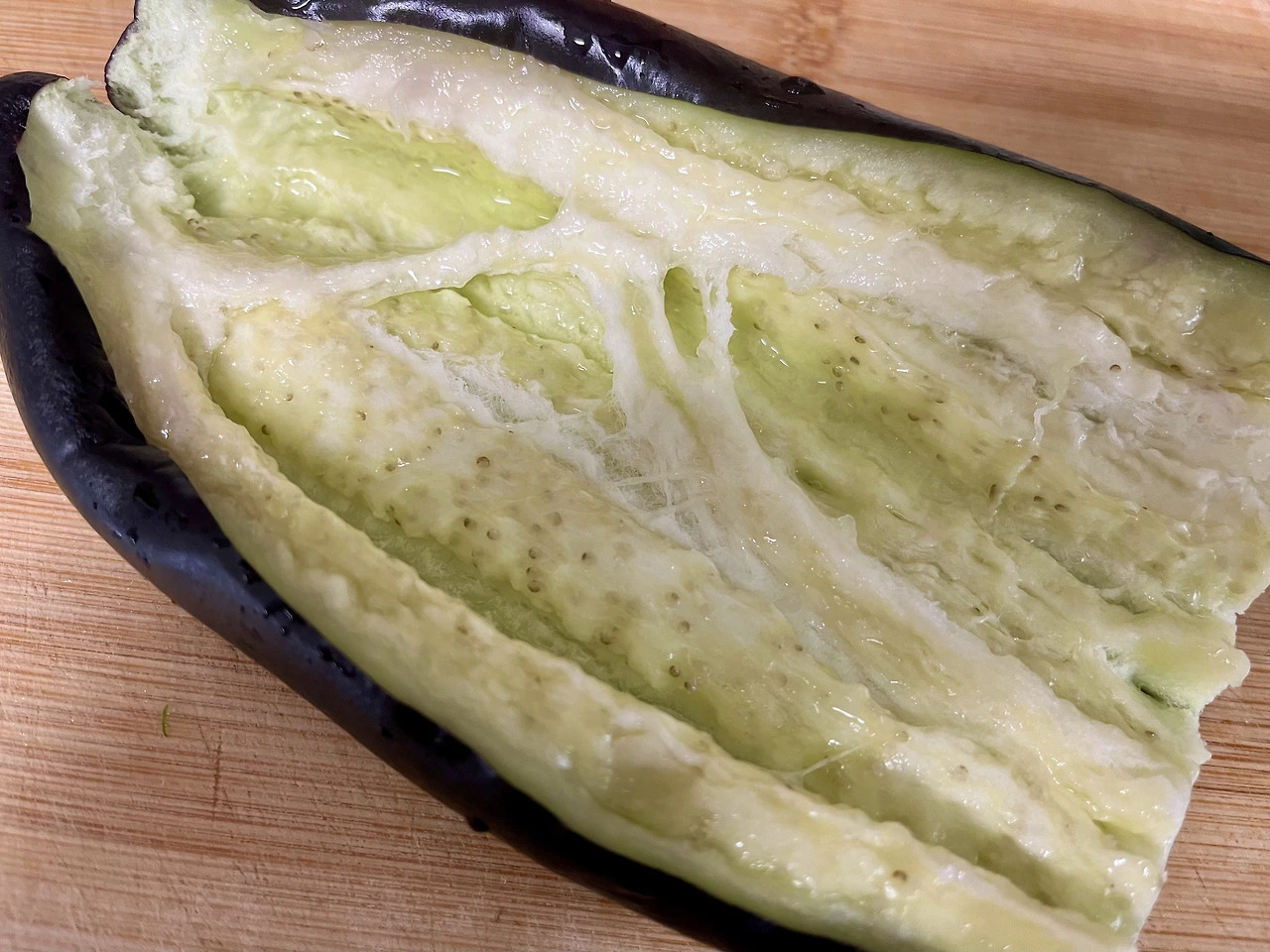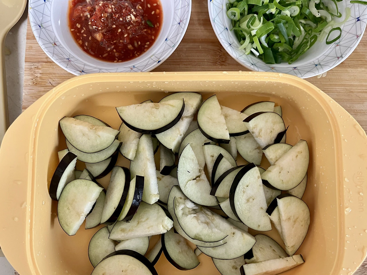 1. 가지를 반으로 자르고 얇게 썰어