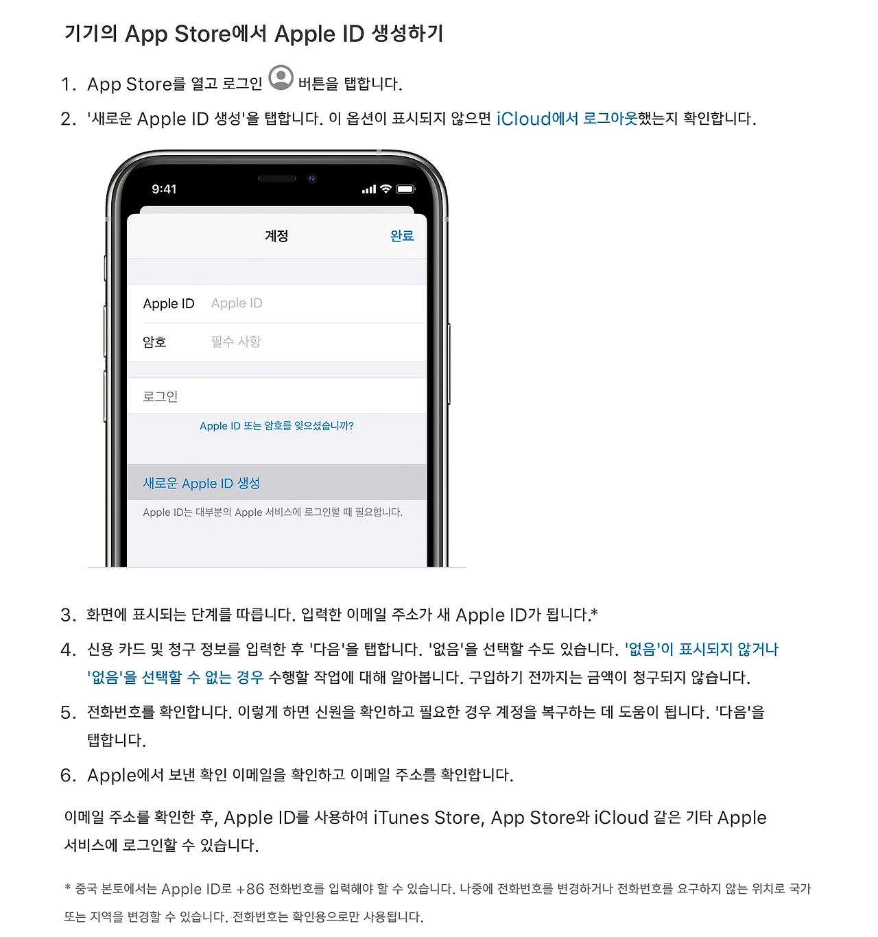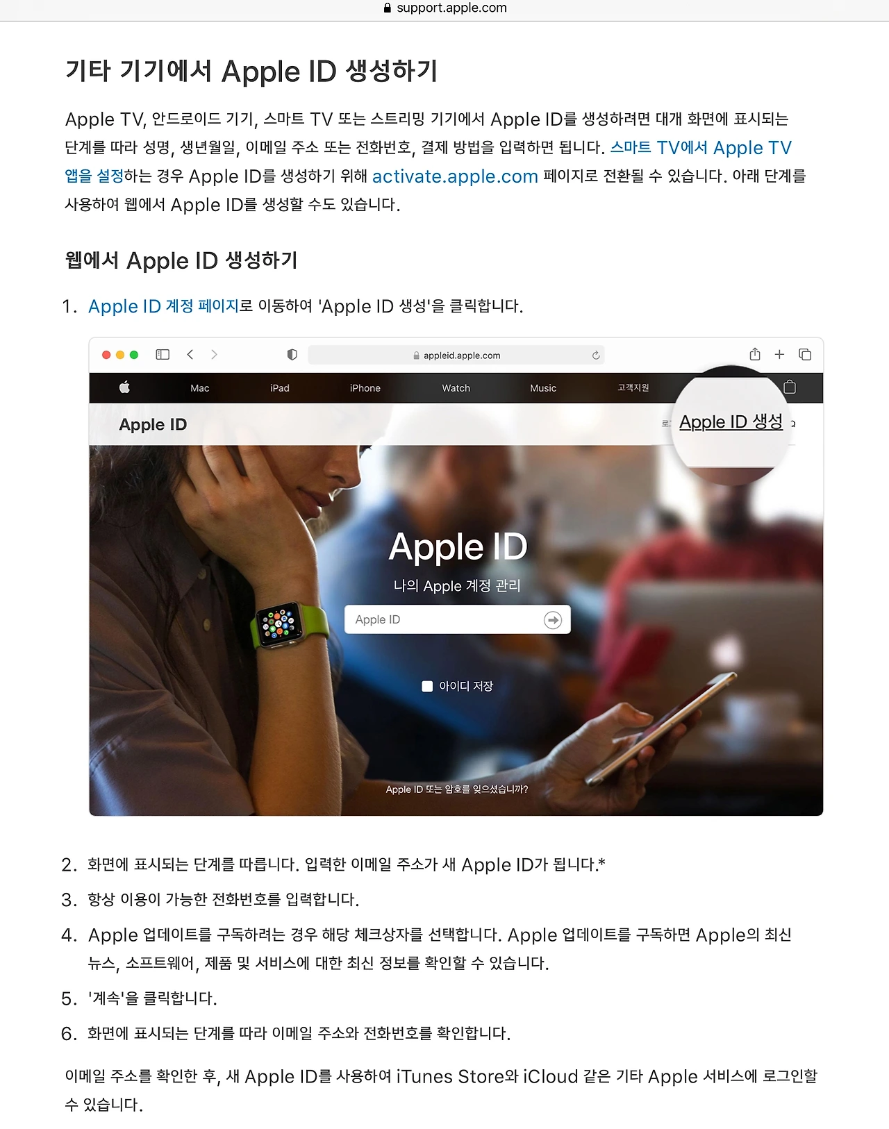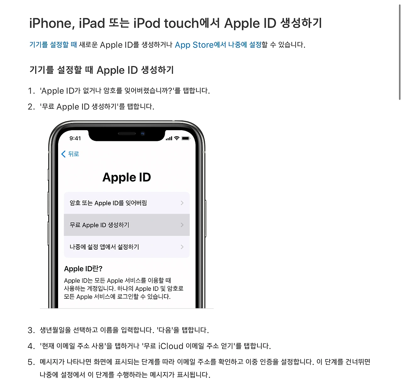 홈페이지에 나와있는 애플 아이디 생성하기 (= 아이클라우드 가입 방법)를 아래 캡처본으로 공유합니다.