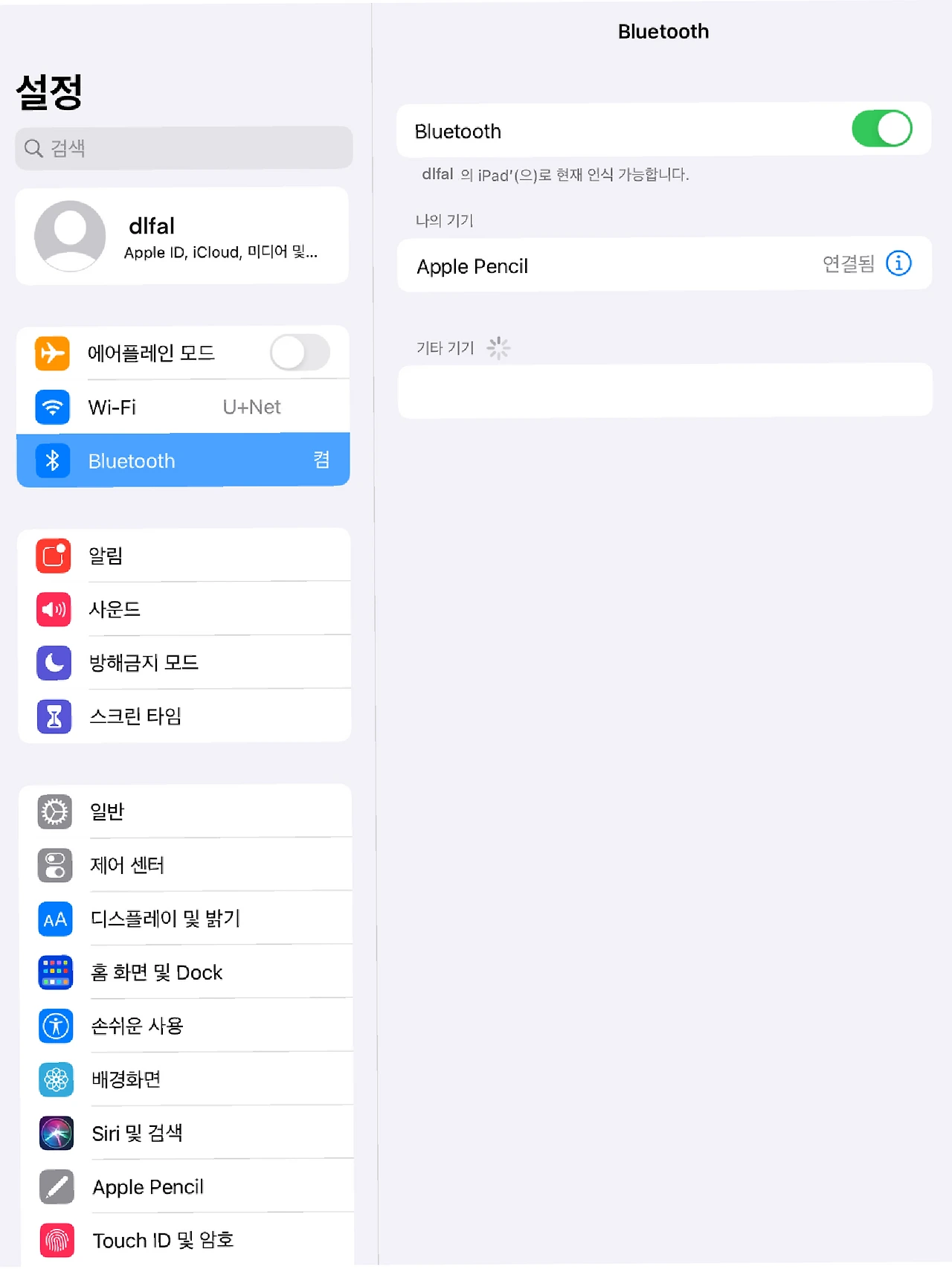 보이는 것처럼 '나의 기기'라고 작게 쓰인 곳 아래 '애플 펜슬 연결됨'이라고 나오면 성공!