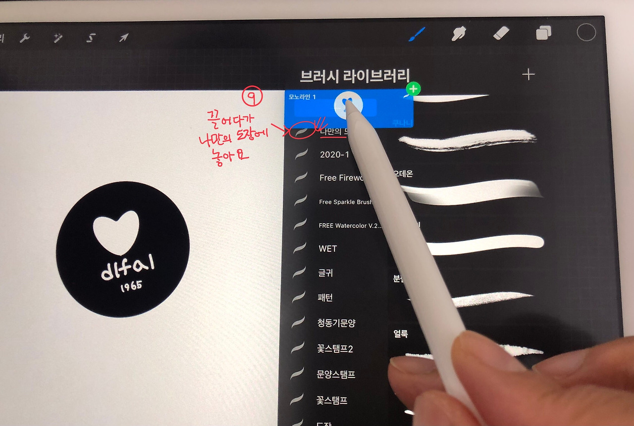 13. 만든 도장 브러시를 펜으로 끌고 올라가 위 사진처럼 <나만의 브러시>에 놓아요.