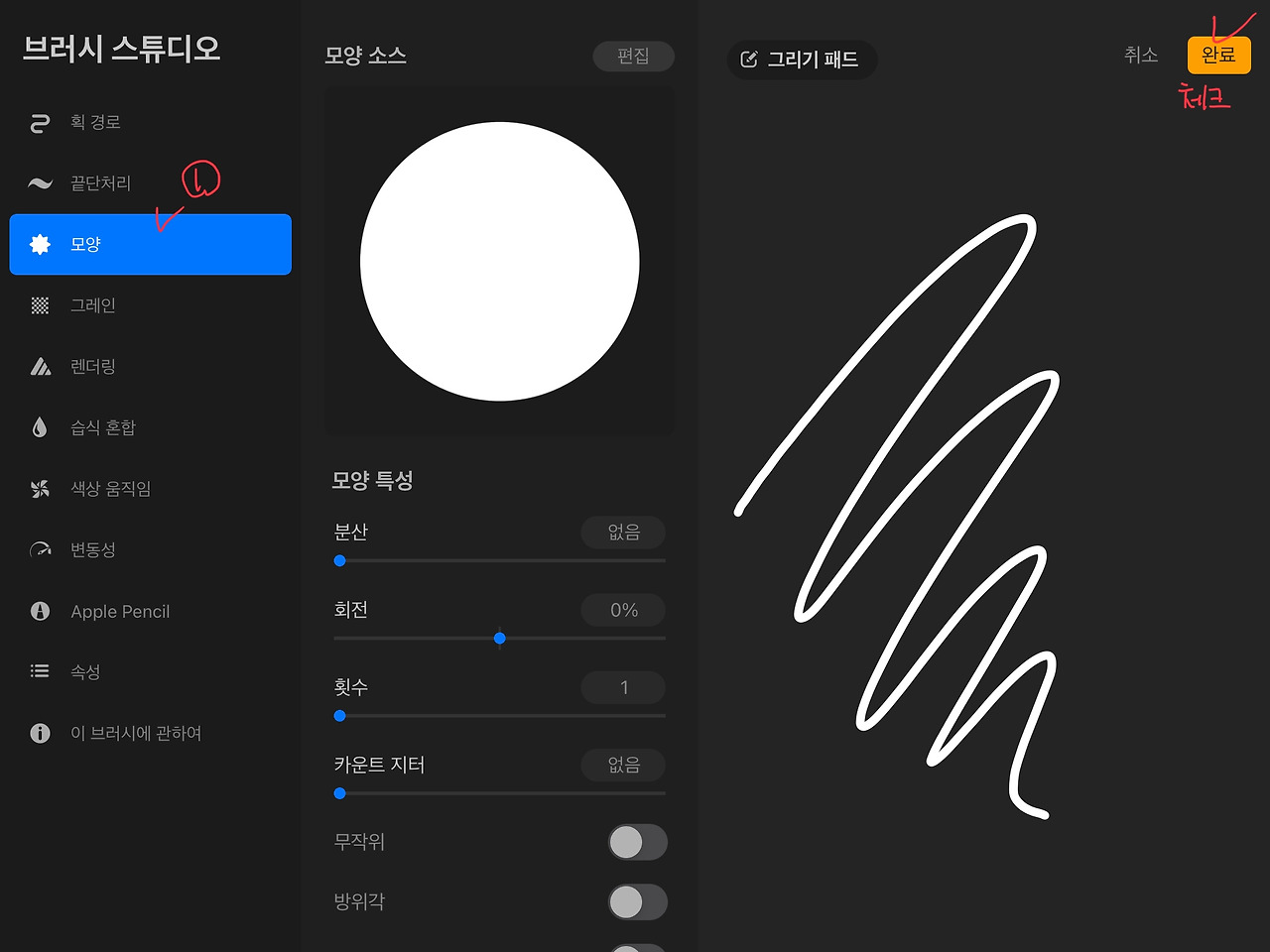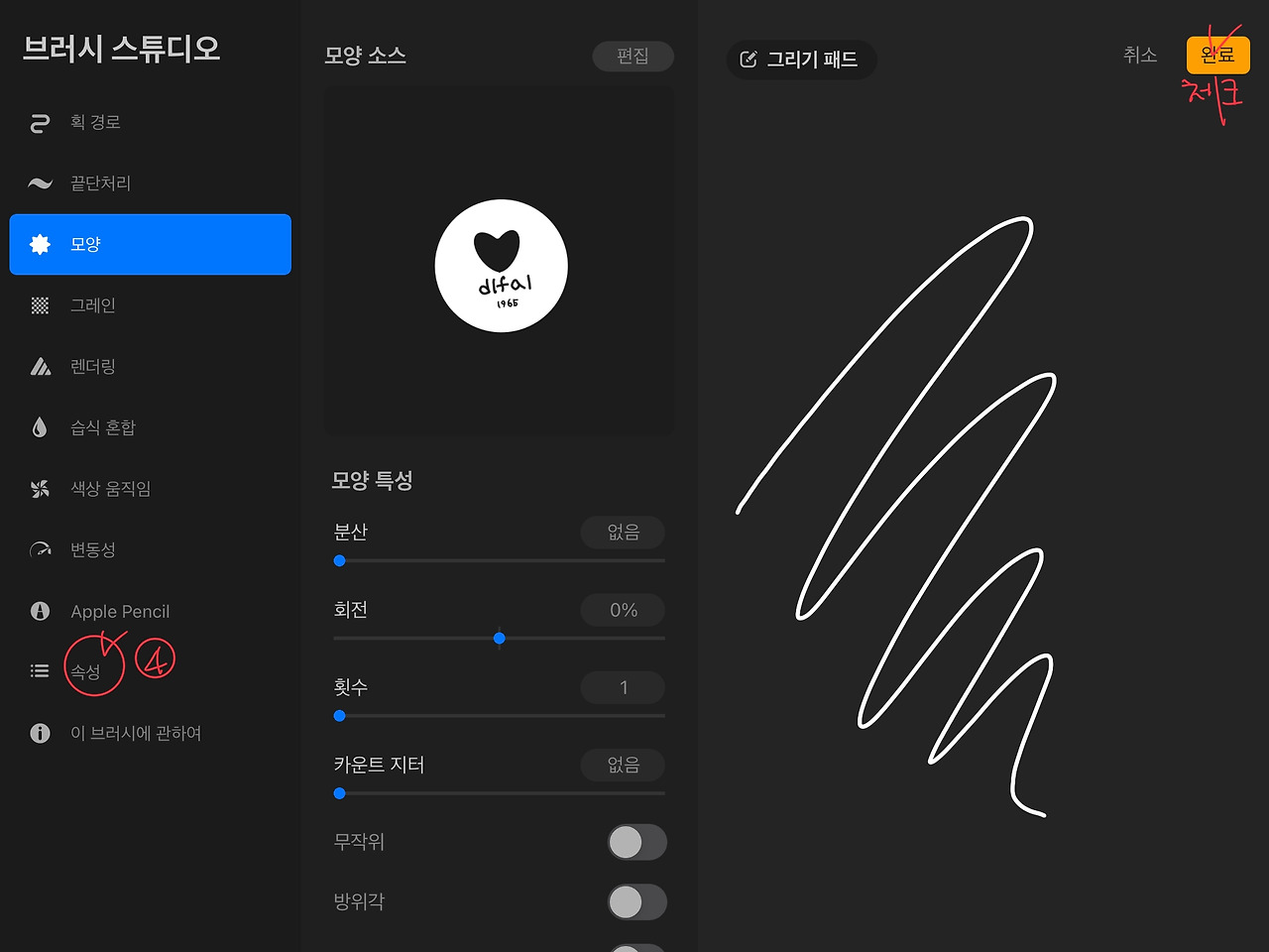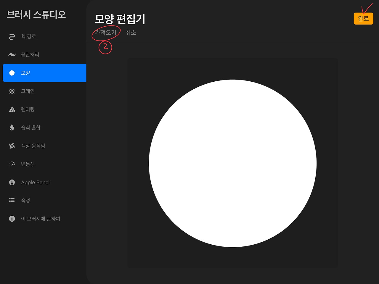 5. 브러시 스튜디오의 모양으로 들어가서 ‘편집’을 누릅니다. ‘완료’ 버튼 꼭 눌러 주세요.