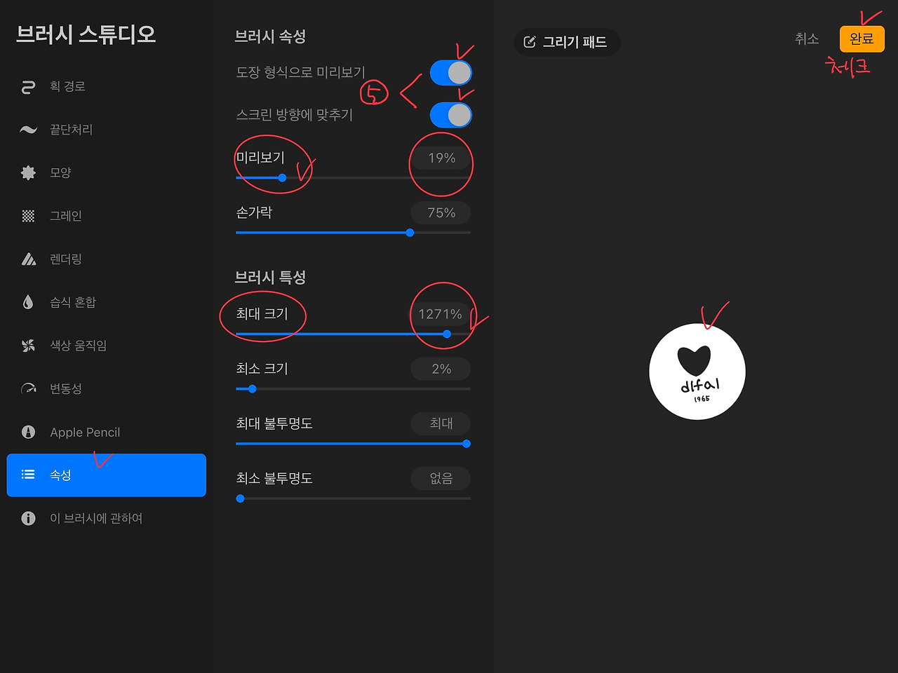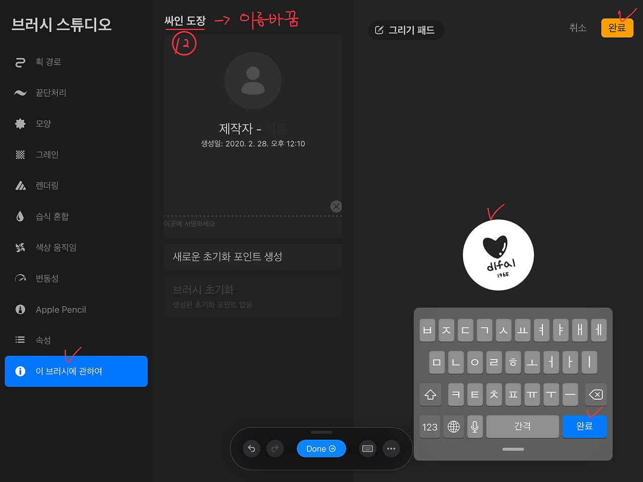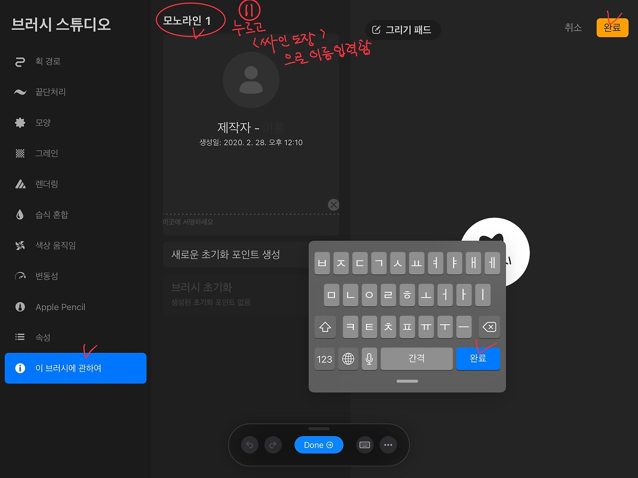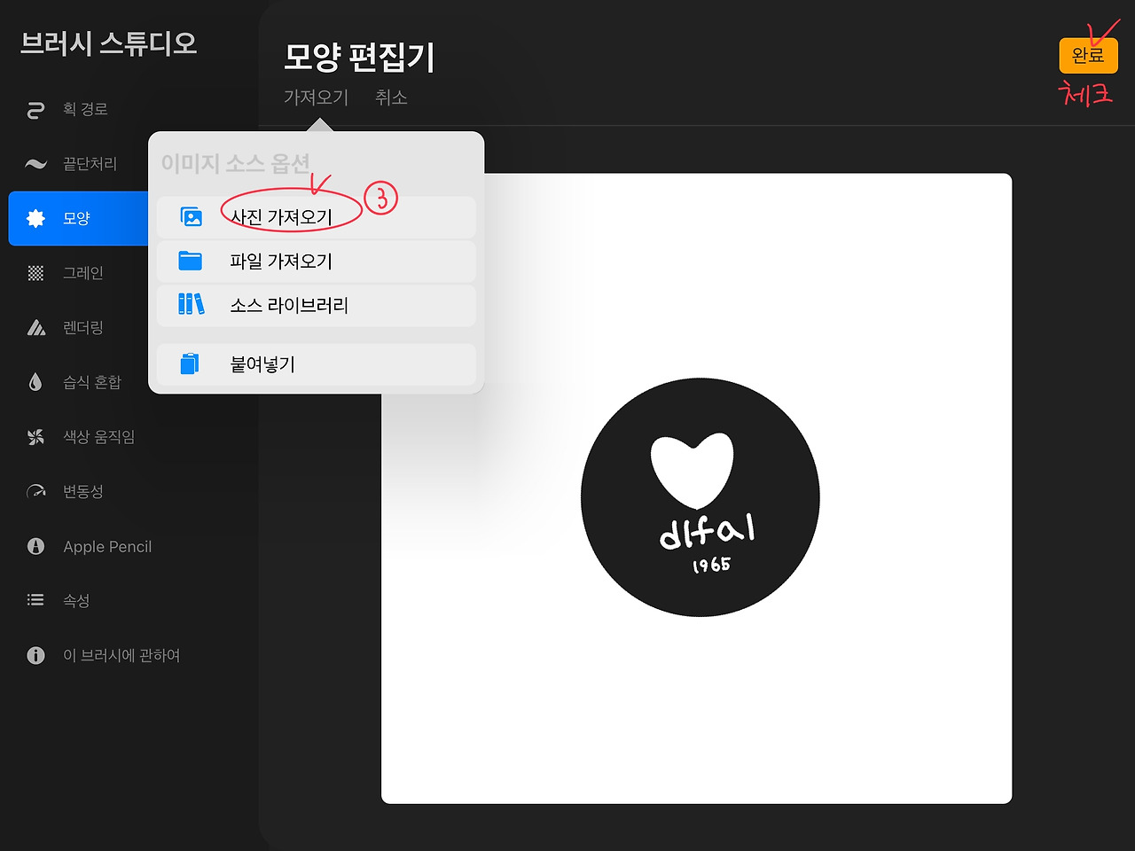 5. 브러시 스튜디오의 모양으로 들어가서 ‘편집’을 누릅니다. ‘완료’ 버튼 꼭 눌러 주세요.