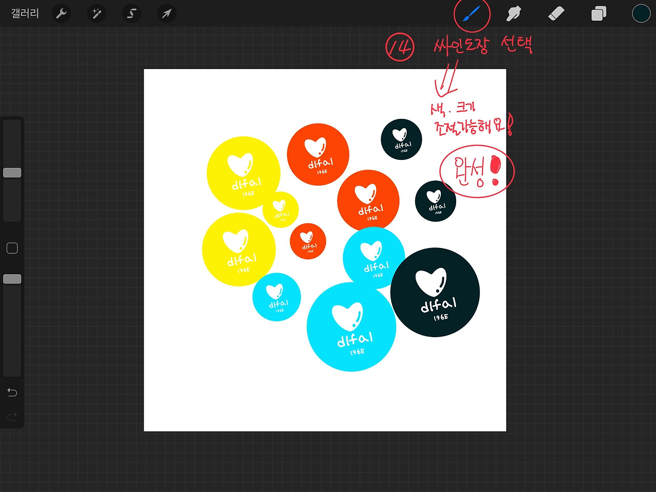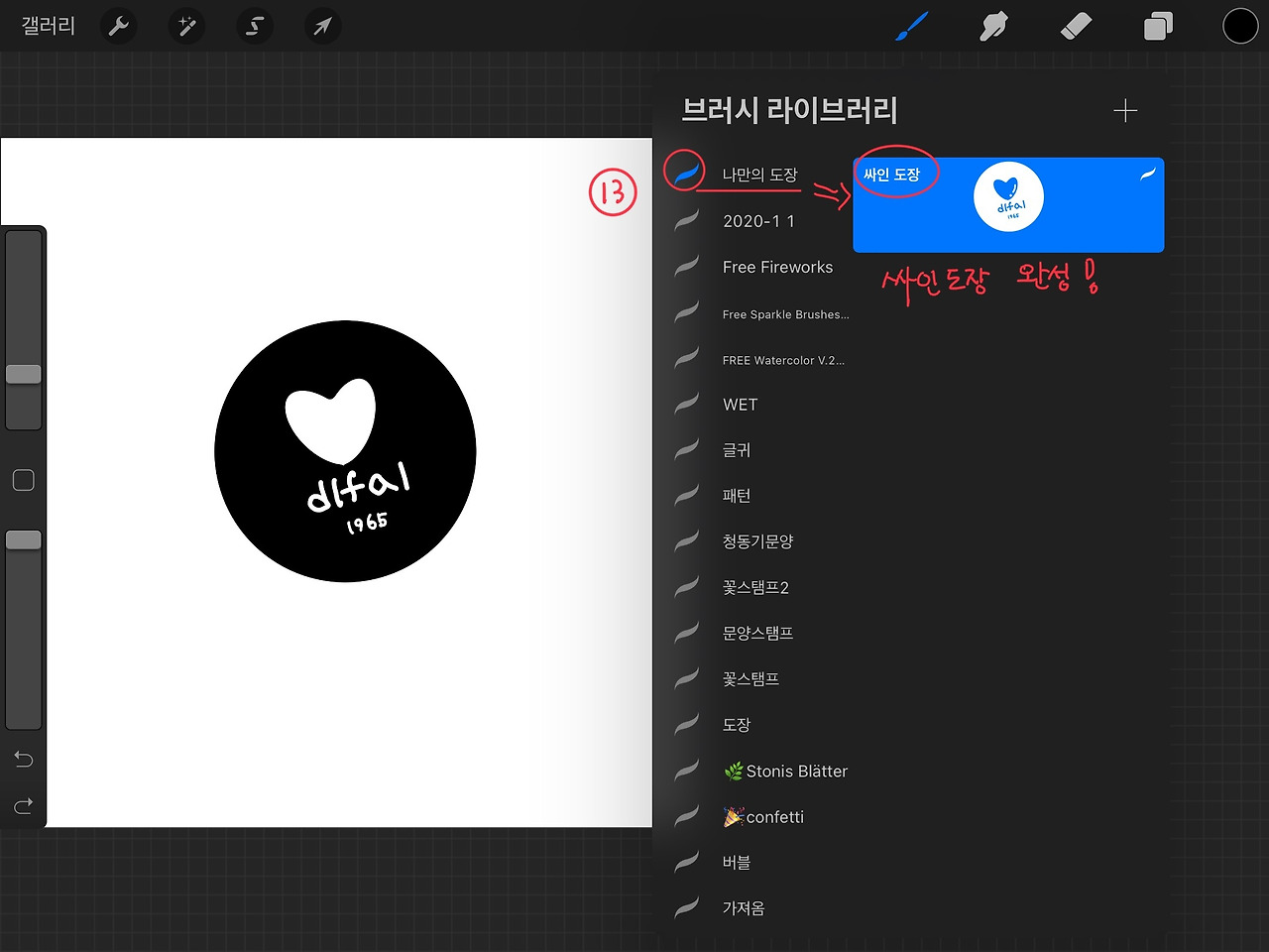 17. 완성! 브러시 라이버러리에 제목도 바꿨고, 싸인 도장이 완성되어 제자리에 들어갔어요.