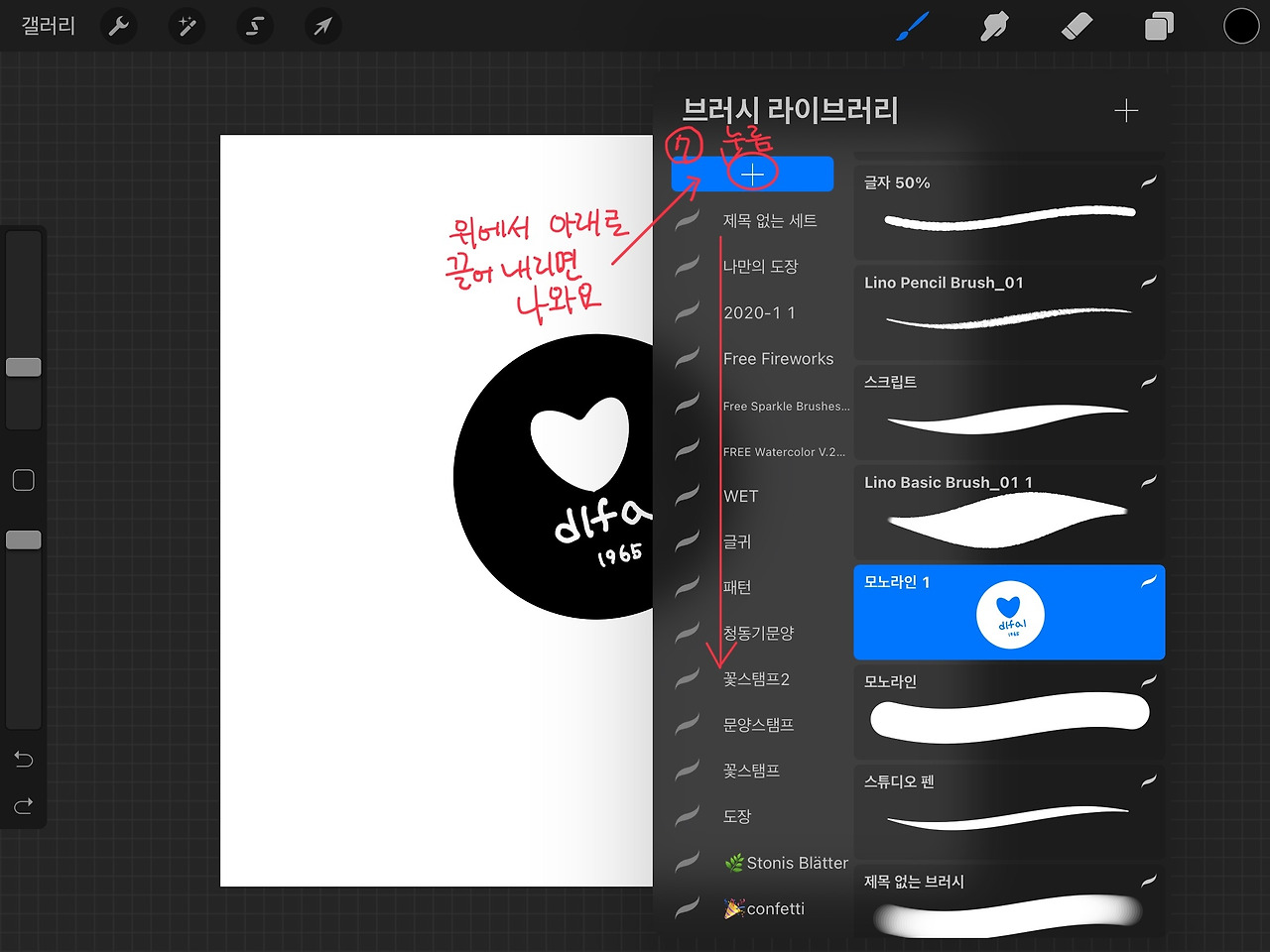 11. 아래 사진처럼 브러시 라이브러리를 아래로 당기면 + 가 나옵니다. +를 누르면 제목 없는 세트라고 나와요