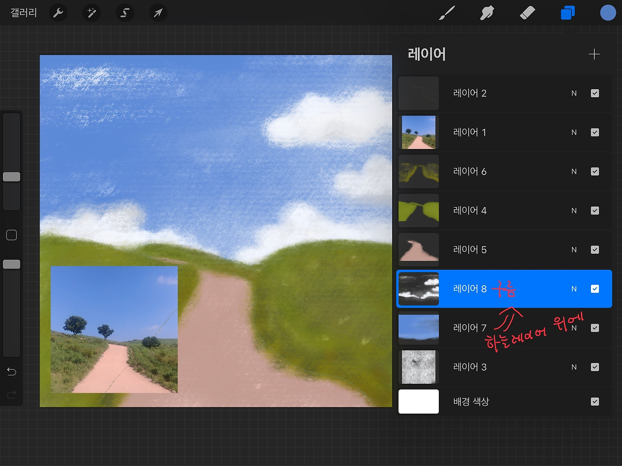 하늘 '레이어 7' 위에 '레이어 8'을 추가 해 구름을 그려 줍니다.