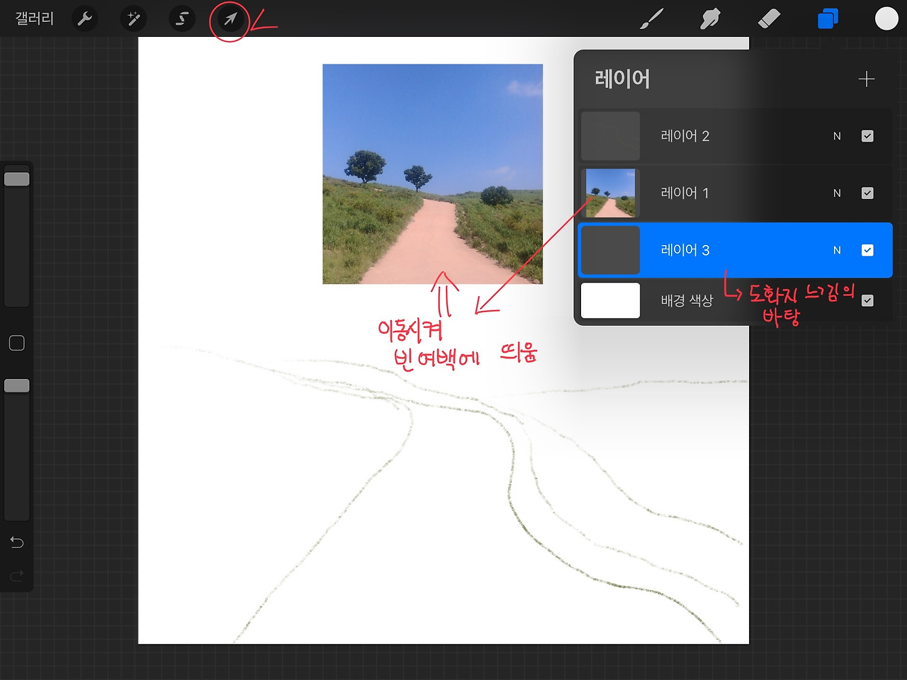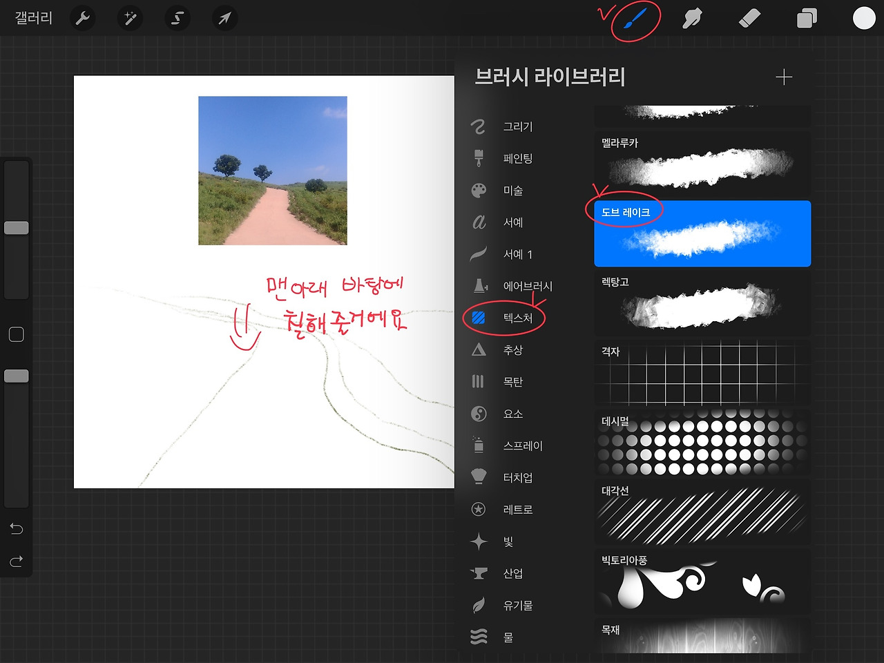스포이드로 사진 속의 언덕 색을 추출한 후, 펜을 힘주어 누르지 말고 가볍게 동글동글 칠해보세요.