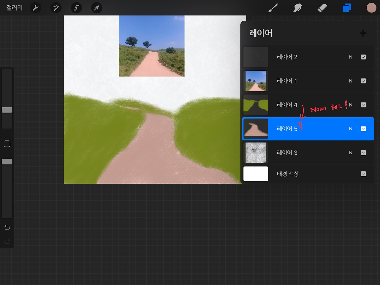 '레이어 5'를 추가해 언덕 '레이어 4' 아래에 두고 길을 칠합니다.