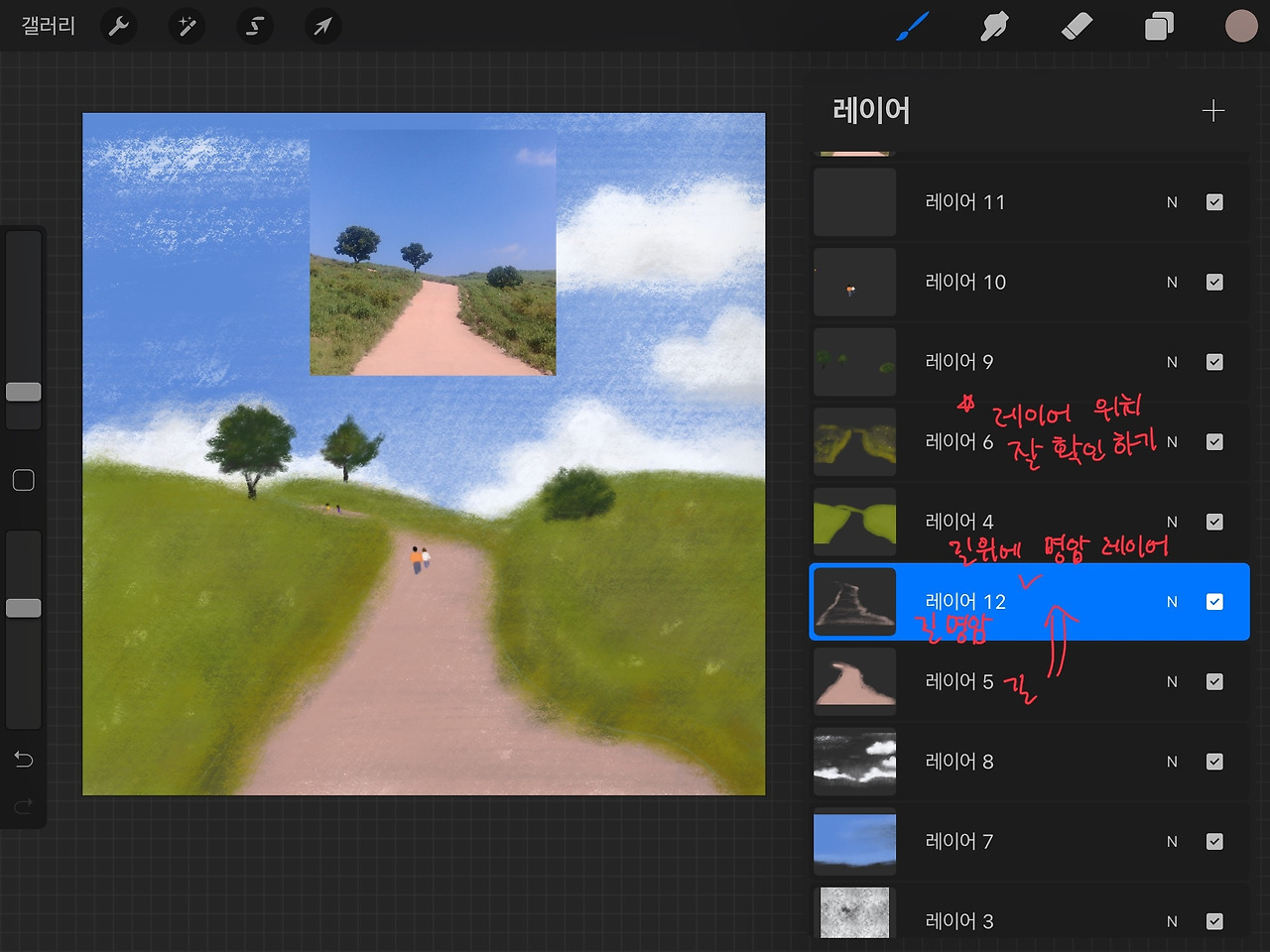길 '레이어 5'를 찾아 그 위에 '레이어 12'를 추가해 길의 명암을 넣어 줍니다.