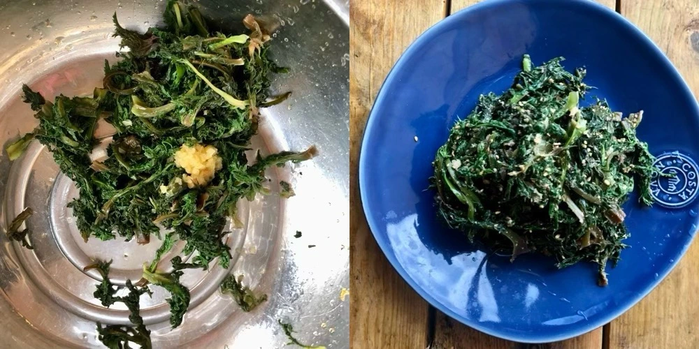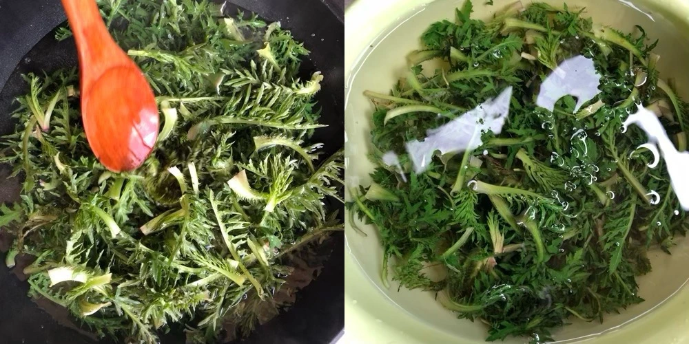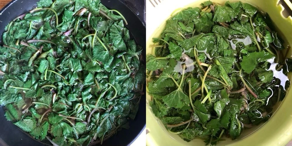 1. 어린 새순은 끓는 물에 굵은소금 약간 넣고 1분 정도 데친 다음, 찬물에 깨끗이 헹궈요.