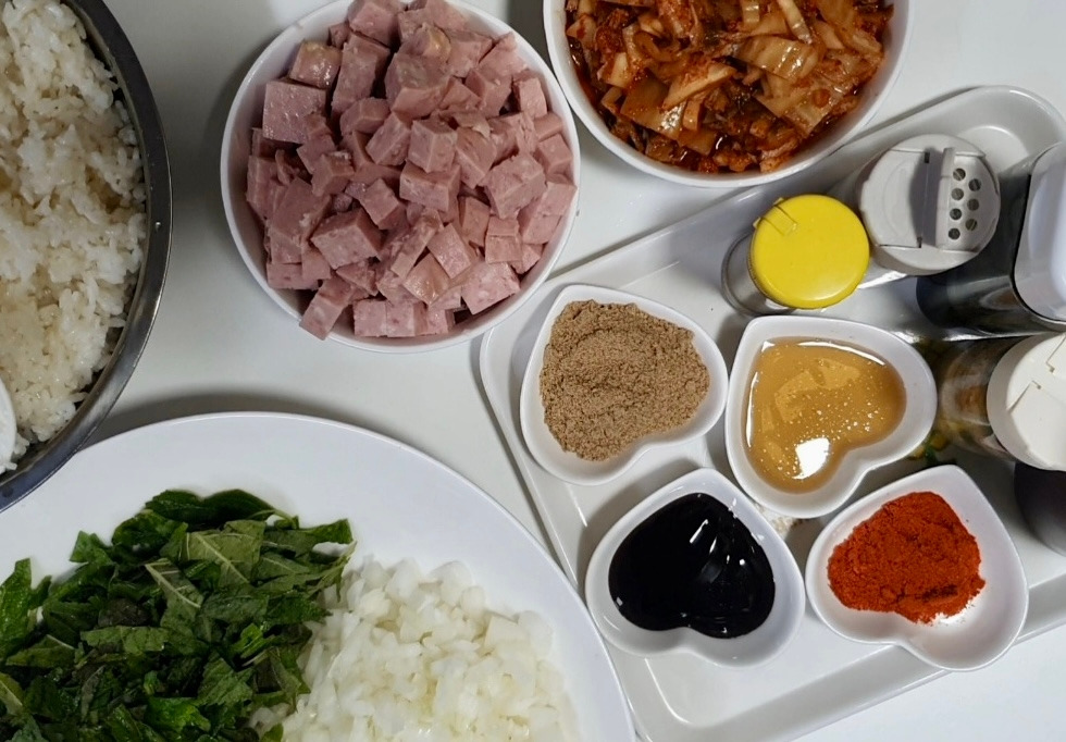 (익혀서 나중에 넣어야 스팸의 네모난 형태가 살아있음)