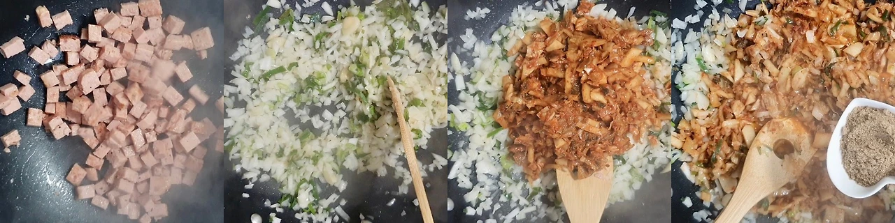 1. 달군 팬에 깍둑썰기한 스팸을 넣고 굽듯이 볶은 다음 (3분 정도) 후추 톡톡 하고 따로 그릇에 담아둔다