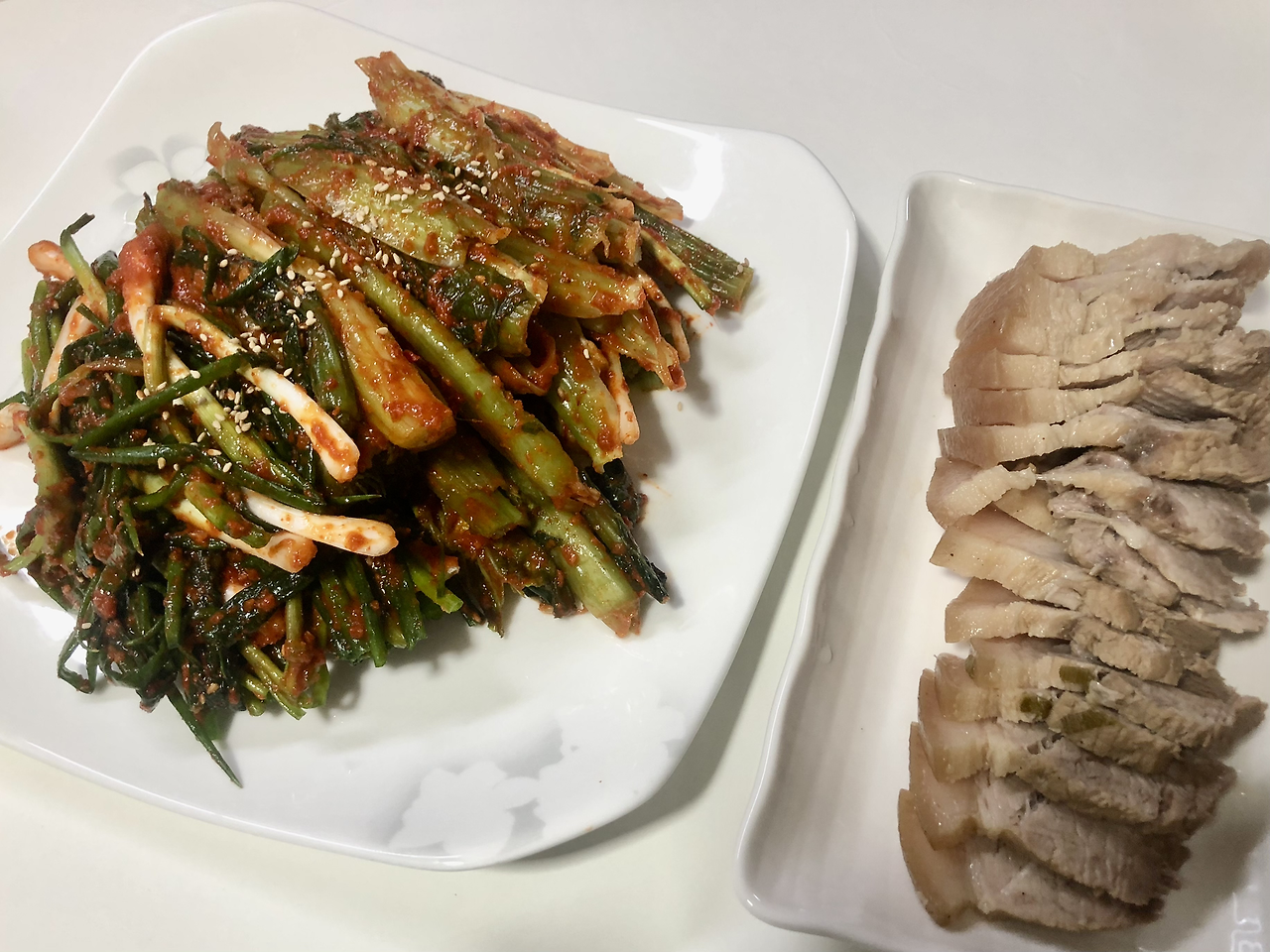 갓 한 줄에 도톰하고 야들야들한 수육 한 점 올려주고, 기다란 파김치도 한 줄... 톡 쏘는 알싸한 맛이 고기와 어우러져 환상적이다.