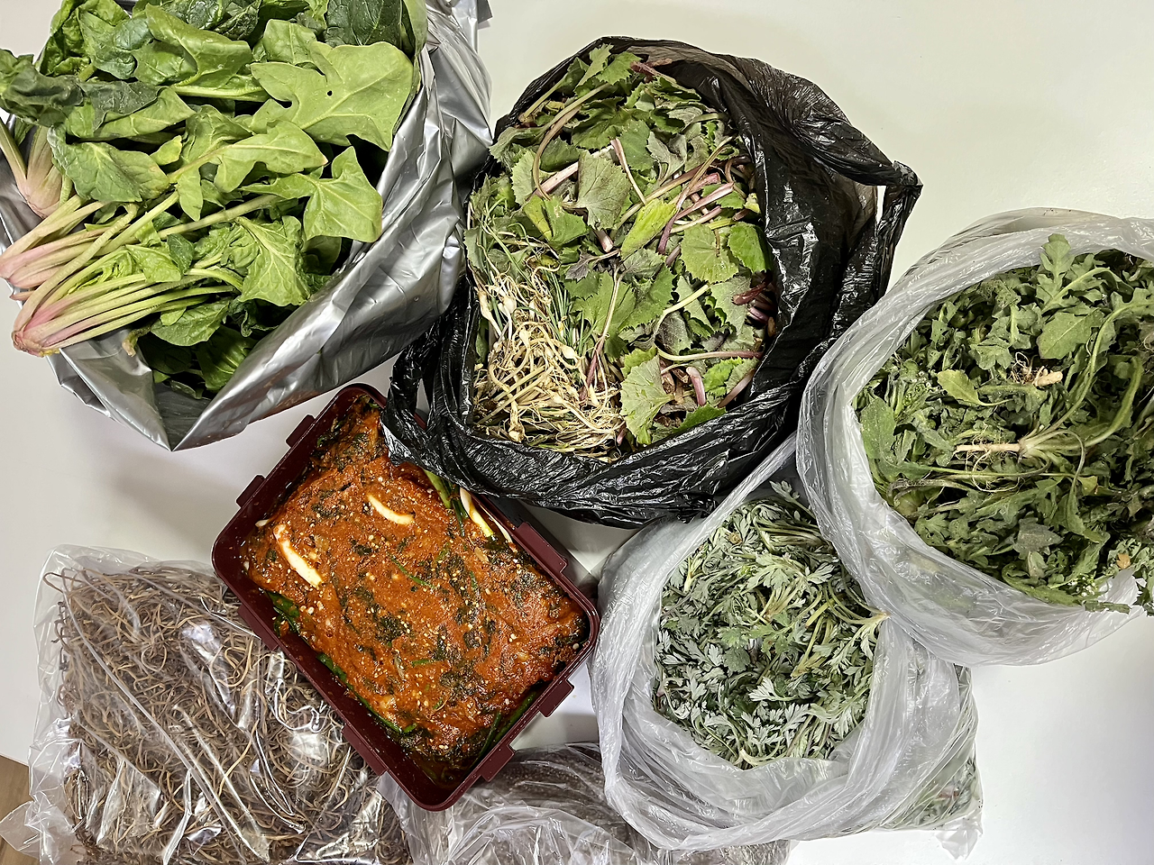 고들빼기 쪽파김치를 비롯해 냉이, 달래, 머위, 쑥, 남해 시금치, 거기다 정성스레 말려 뒀던 고구마 줄기에, 텃밭에서 수확한 들깨까지...