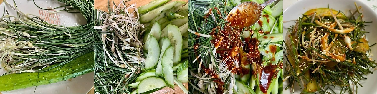 -달래는 뿌리채로 잘 씻어 먹기 좋은 크기로 자르고, 오이는 길이대로 반 잘라 얇게 어슷 썬다.