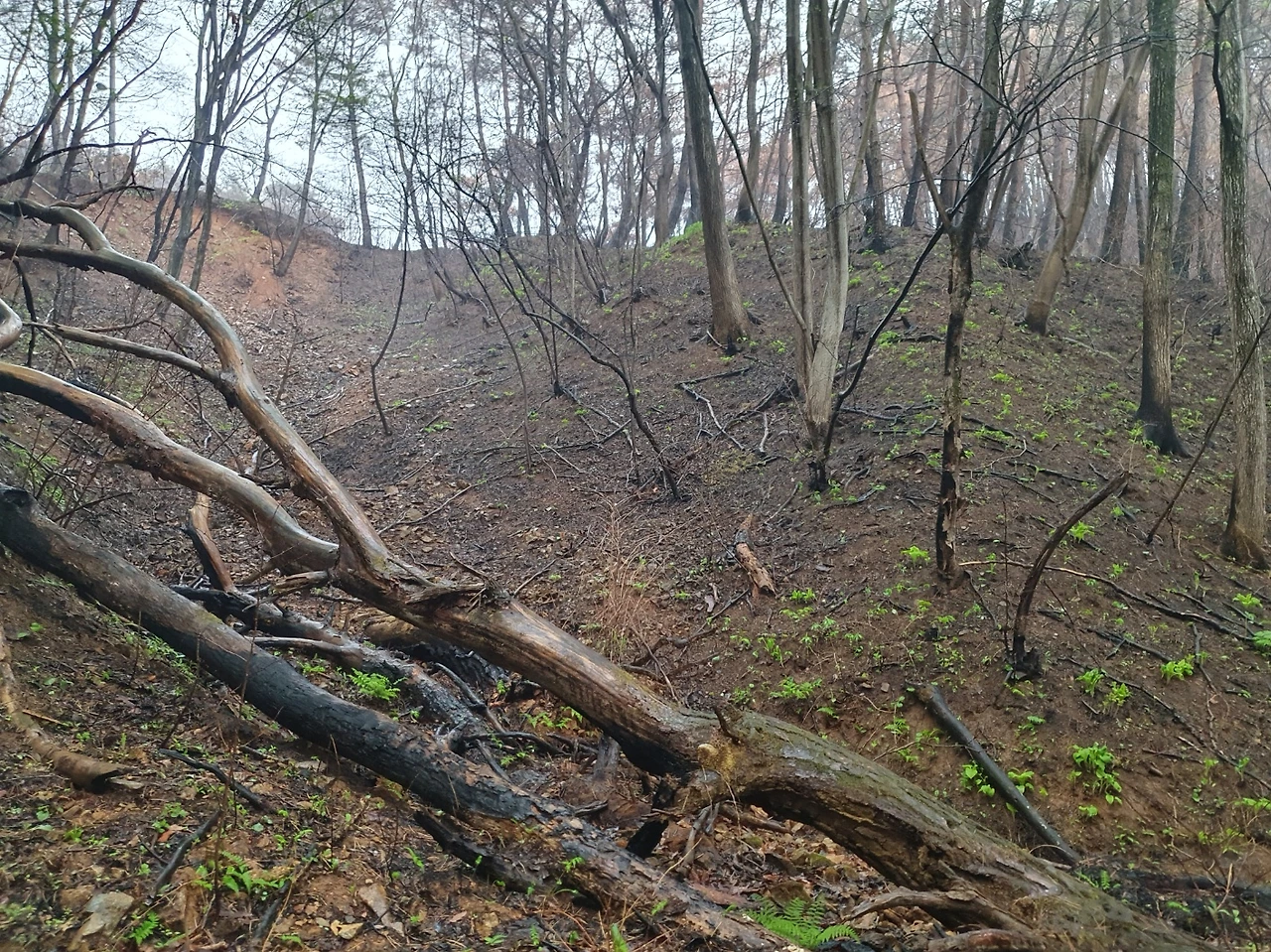 실제로 불길이 지나간 자리와 비켜간 자리는 뚜렷이 구분되었다. 검은 자국과 초록이 얼룩무늬처럼 교차해 있었다.