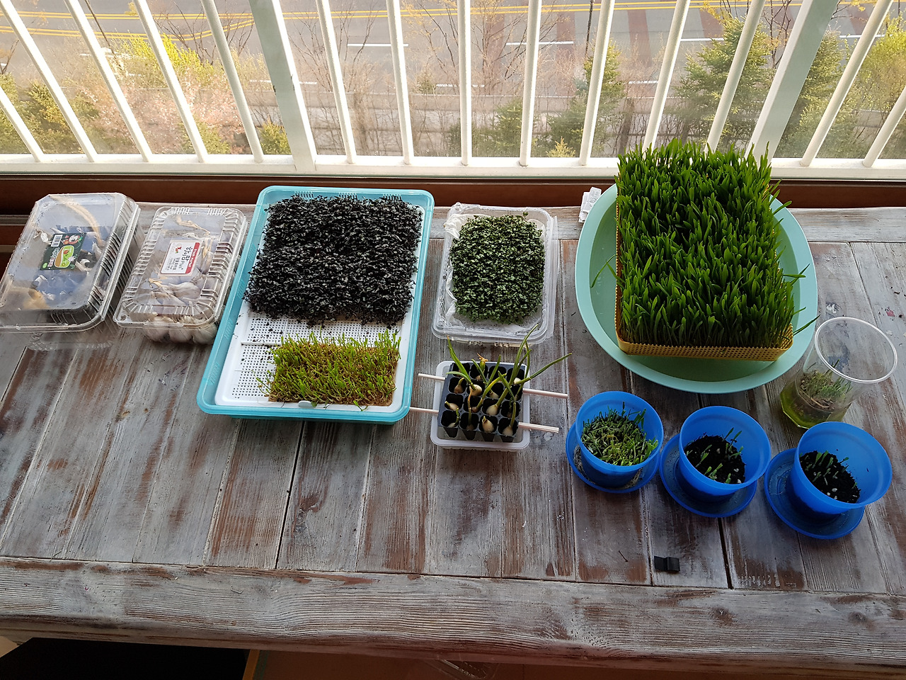 이왕 할 바에는 잘해야 한다는 게 내 지론이다. 홈쇼핑에서 얻은 얄팍한 지식으로 새싹보리와 어린 새싹을 키우기로 했다. 우선 보리씨앗1키로와 재배틀, 각종 새싹 채소 10여종을 구매하여 방구석 텃밭을 만들었다. 씨앗을 8시간 동안 물에 불려 재배틀에 가지런히 깔고 아침 저녁으로 물을 주고 정성을 들이니 정말 연두빛 새싹이 나왔다. 농사짓는 분들의 기쁨을 알 수 있었다. 내가 물주고 이뻐한 보람이 생겼다. 보리새싹은 15센티미터 정도 자라면 잘라서 샐러드 및 쌈으로 먹고 각종 새싹 채소는 멸치와 깻잎에 싸서 꼬마 김밥을 만드니 그럴 듯한 음식이 되었고 저절로 건강해지는 기분이 들었다.