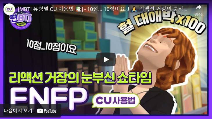 혹시 보스님 '플로타곤'에 대해 아시나요? 저는 플로타곤의 존재 자체는 알았지만, 이름은 이번 레퍼런스를 준비하며 처음 들어봤어요. 플로타곤은 위에 있는 영상을 제작할 때 사용된 3D 애니메이션 비디오 제작 앱인데요. 한국어 서비스를 지원하지 않아서 'Saranghae(사랑해)'처럼 영어 발음으로 어색한 한국어를 대체한 것이 사람들의 인기를 끈 것이에요. 특히, 플로타곤으로 제작한 MBTI 영상은 Z세대에게 '유튜브 조회 수 치트키'라고 불릴 정도로 인기인데요. 씨유가 이 유행에 탑승한 것이죠! MZ세대를 저격한 콘텐츠로 브랜드도 톡톡히 홍보하고 친근한 이미지도 챙기는 일석이조의 효과를 얻을 수 있겠어요.