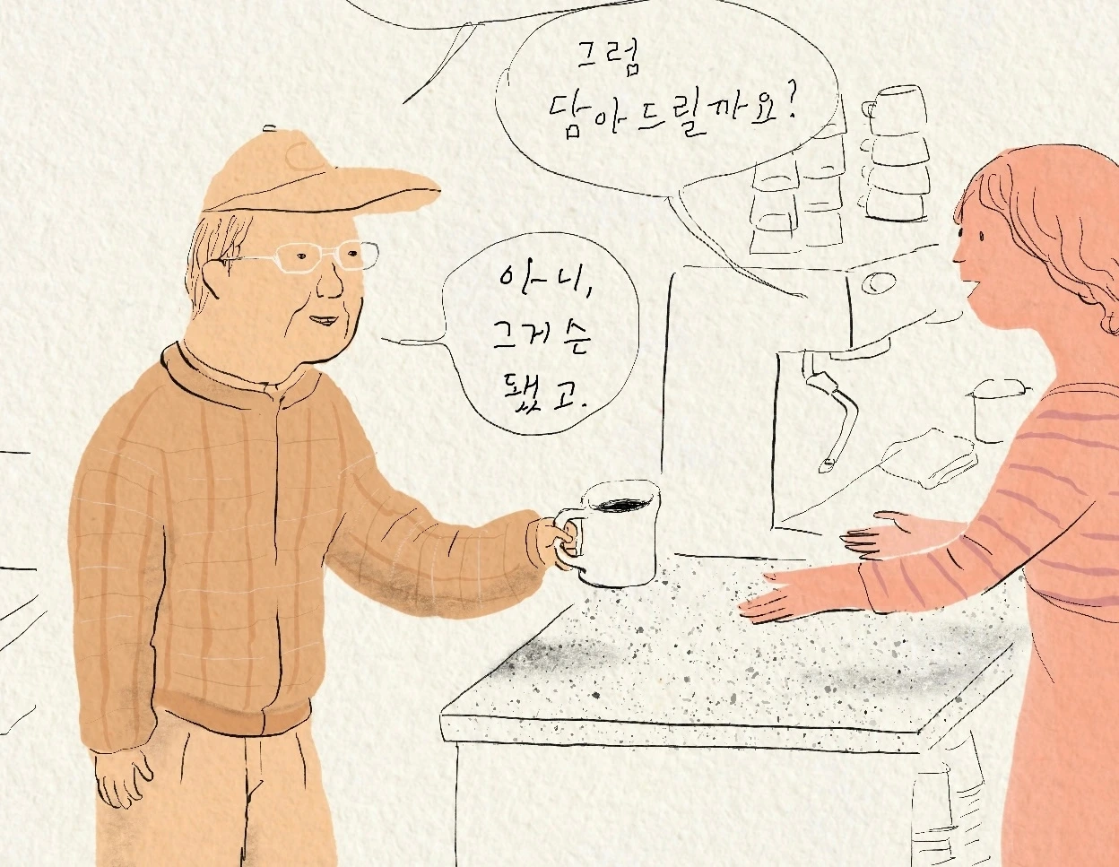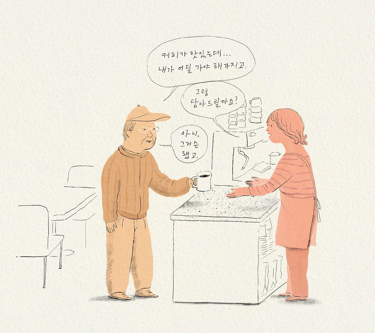 커피를 남긴 것이 맛이 없어서가 아니라는 말을 건네는 할아버지의 모습이 상냥해 웃음이 나왔습니다. #아니그거슨됐고