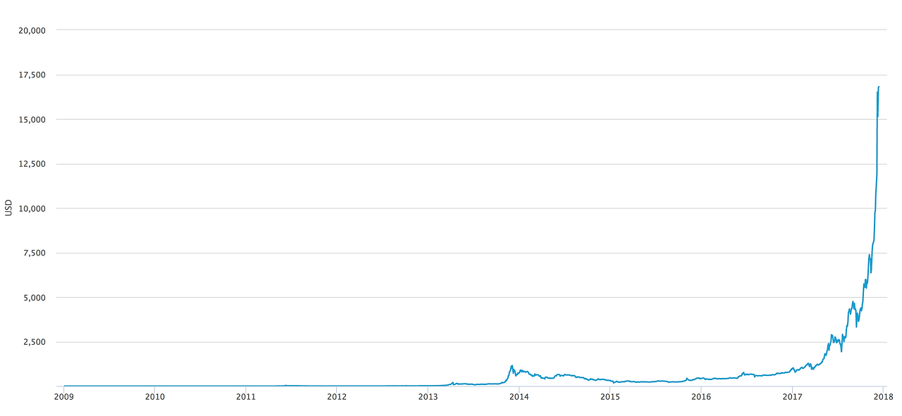 놀랍게도 이 그래프가 2009년부터 거래가 시작된 비트코인의 시장가격 추세다. 피자 2판에 1만BTC하던 비트코인 가격이 이제 1BTC에 $16,000을 훌쩍 넘어 버렸다. 더 놀라운 것은 내일 가격이 또 얼마나 될지 아무도 모른다는 것.