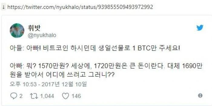 문제는 그 진폭이다. 하루에 기껏해야 몇 원씩 등락을 반복하는 대개의 통화와는 달리, 비트코인의 환율은 매일 천국과 지옥을 오간다. 오죽했으면 SNS에 이런 우스갯 트윗까지 등장하겠는가(실은 우스개가 아닌 게 더 문제지만).