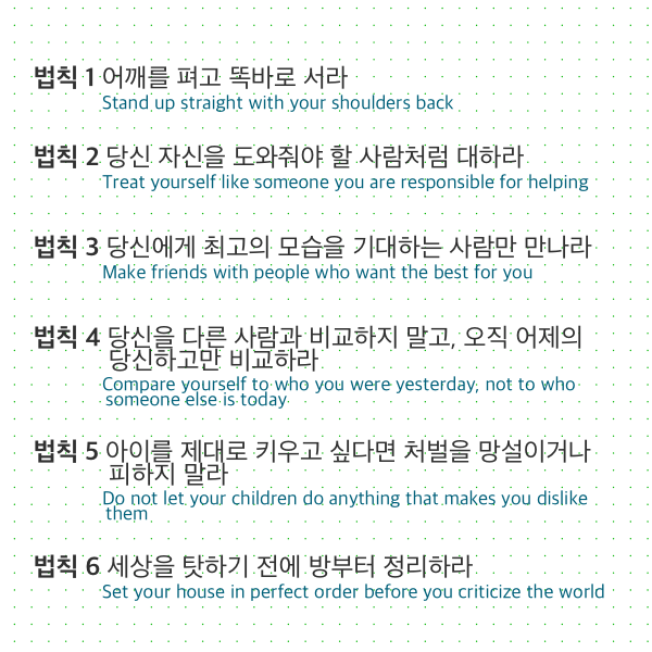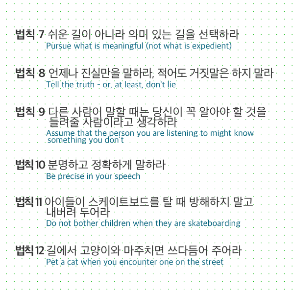 언뜻 보기에 바로 의미가 전달되는 지침도 있고 무슨 말인지 잘 와닿지 않는 법칙도 있을 것이다. 내겐 특히 11번째 법칙과 12번째 법칙이 그랬다. 무슨 말이지? 궁금했다.