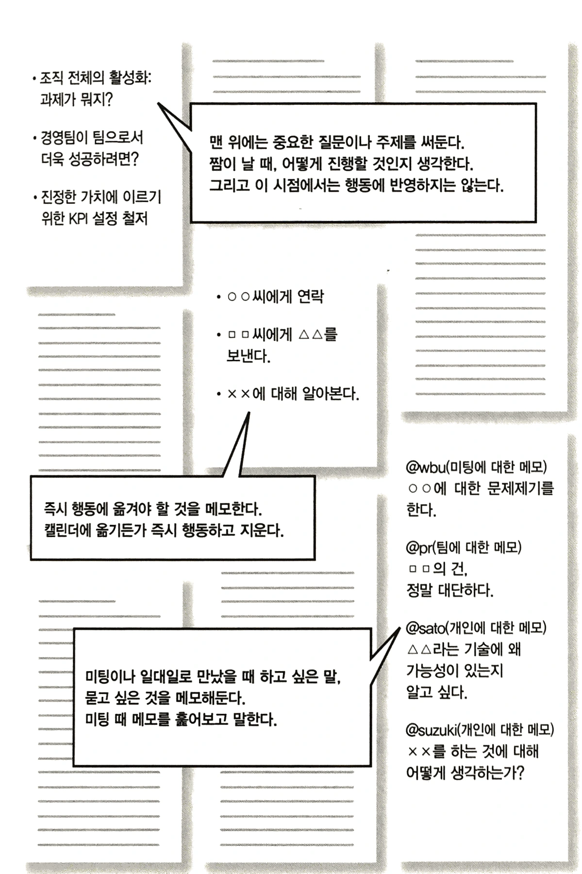 그 아래에는 미팅이나 모임 등에서 특정 사람에게 하고 싶은 말이나 묻고 싶은 것을 메모한다.