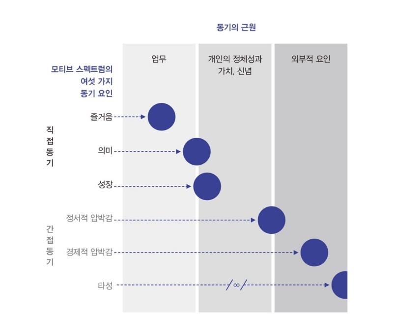 일의 즐거움, 의미, 성장을 '직접 동기'라고 한다. 동기의 근원이 내부에 있다고 해서 '내적 동기'라고도 한다. 정서적 압박감, 경제적 압박감, 타성을 '간접 동기'라고 한다. 동기의 근원이 외부에 있다고 해서 '외적 동기'라고도 한다. 모티브 스펙트럼에 의하면, 결국 개인의 직접 동기(내적 동기)로부터 높은 성과가 나온다.