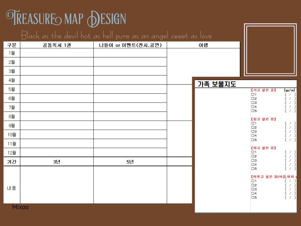 행복한 시간을 디자인하는데 핵심은 무엇인가? 나는 시작도 끝도 ‘대화’라고 생각한다. 서로 대화가 끊어진다는 것은 공유할 관심이 없어진다는 것이고, 그것은 더 이상 '경제 공동체'이지 '행복 공동체'는 아니다. 그래서 아내와 맞는 첫 연말 어떻게 대화가 끊이지 않게 할 수 있을까 고민하다가 만든 것이 바로 이 '가족 보물지도'다.
