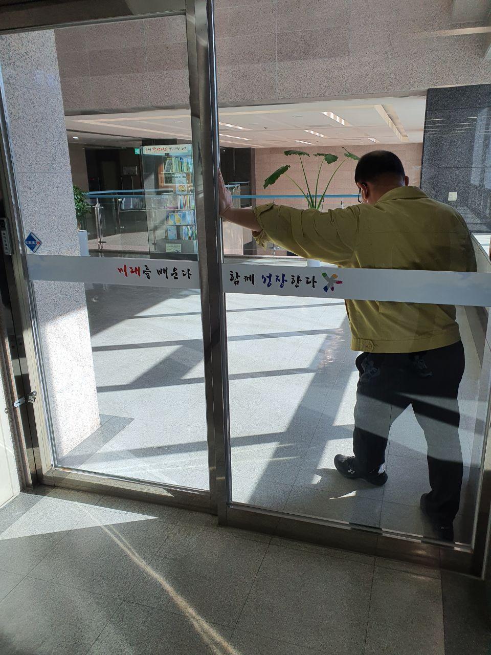 < 교육청 출입문을 막고 있는 직원의 모습. ‘다 품’는 것이 아니라 ‘다 배제’,‘다 통제’를 보여주는 상징적 모습이다. >
