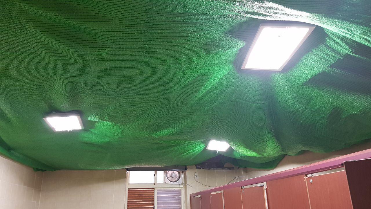<그림 4 학기 중 사용 중인 화장실 건물 천장이 모두 이런 식으로 천막을 이용해 막아 놓았다. 수많은 학생들과 교사들이 미세 먼지나 오물 등의 오염 위험에 노출된 셈이다.>