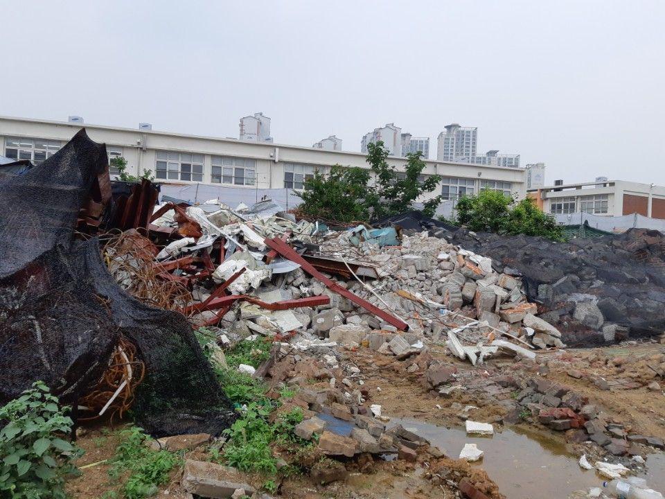 <그림 7 높게 쌓인 폐건축자재 먼지 가루가 언제라도 학교 창문을 들어올 기세이다. 오래된 건축물에는 대부분 석면 성분이 포함되어 있다.