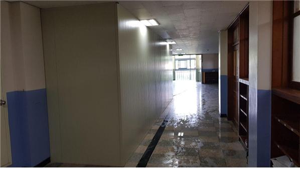 <그림 1 학기 중 공사 중인 화장실 차단 벽, 복도 공간의 절반을 차지했다. 2018년 8월 말>