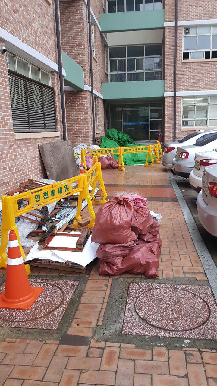 <그림 5 학교 뒤편 주차장 건물에 공사 후 나온 폐자재가 저렇게 놓여 있다.>