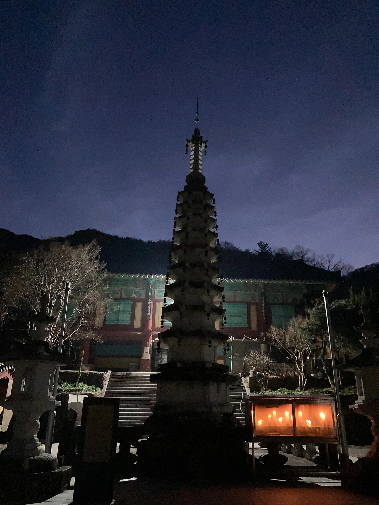 가로등도 없는 새카만 새벽, 어둠을 깨문 작은달 아래 호기심을 잔뜩 품은 여자 넷은 겁도 없이 총총히 걸어 쌍계사로 향했다. 새벽이 주는 고요한 장막아래 우뚝 솟은 팔각구층석탑은 합장한 부처님의 손처럼 차분하고 신비롭게 느껴졌다. 그 외엔 거의 보이지 않는 절을 더듬어 토지 속 탱화이야기에 나올법한 절간으로 들어갔다. 그 안에는 싯다르타의 출가에서부터 해탈, 목련존자, 달마대사를 비롯한 제자(그 외에는 모르마미타불. 제자님들 죄송합니다.)들의 그림이 빽빽이 벽을 채우고 있었다. 혜관스님도 이런 그림을 그렸겠지? 이런 그림을 보며 자라서 길상이의 상상은 생과 사를 넘나들고, 구름에 달 가듯이 무의식과 의식의 경계를 넘나드는 것일까?