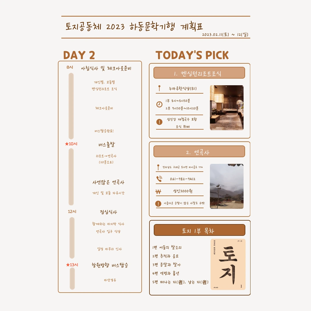 숙소에 도착해서, 다음 일정인 이승윤 교수님의 ’ 소설 <토지>를 읽는 이유 - 1부 독후 만남‘ 에 들어가기까지 30분의 시간 동안 같은 방을 쓰는 조원들과 방으로 들어가 인사를 나누었다. 매주 줌을 통해 ‘토지 하부르타 독서토론‘을 하고 있어 그때 소그룹으로 만난 낯익은 선생님도 계시고, 내가 출석률이 저조해서인지 모르는 선생님도 계셨다.