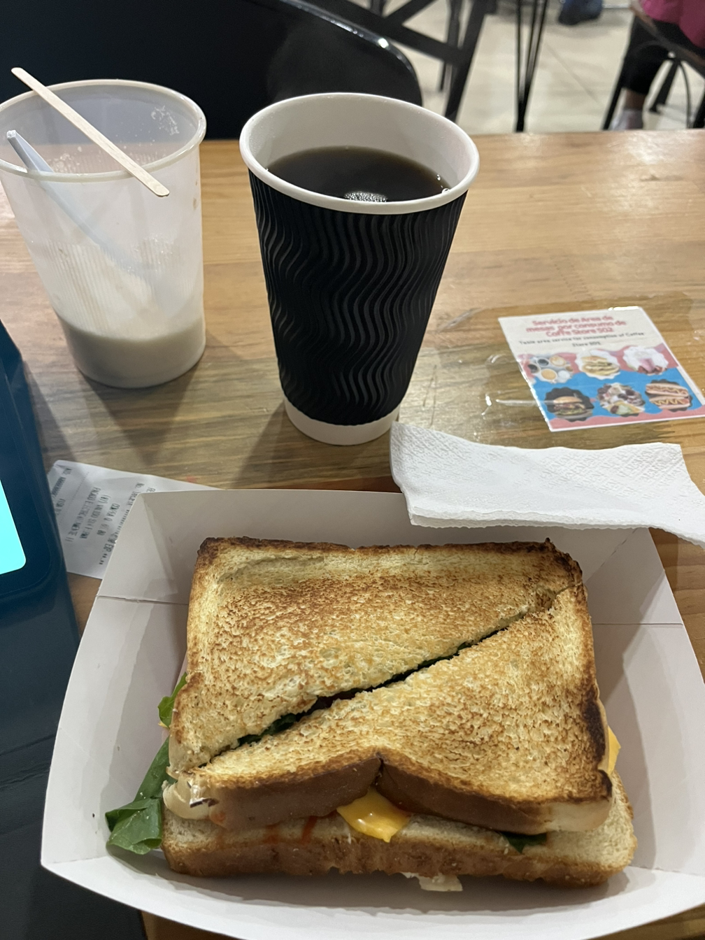구석에 자리를 잡고 나니 커피와 샌드위치를 친절하게 가져다준다. 설탕이 든 큰 플라스틱 통을 가져다준다, 설탕은 필요 없다는 말을 순간 부끄러워할 수 없는 나의 앞에 있는 큰 설탕통이 부담스럽다.
