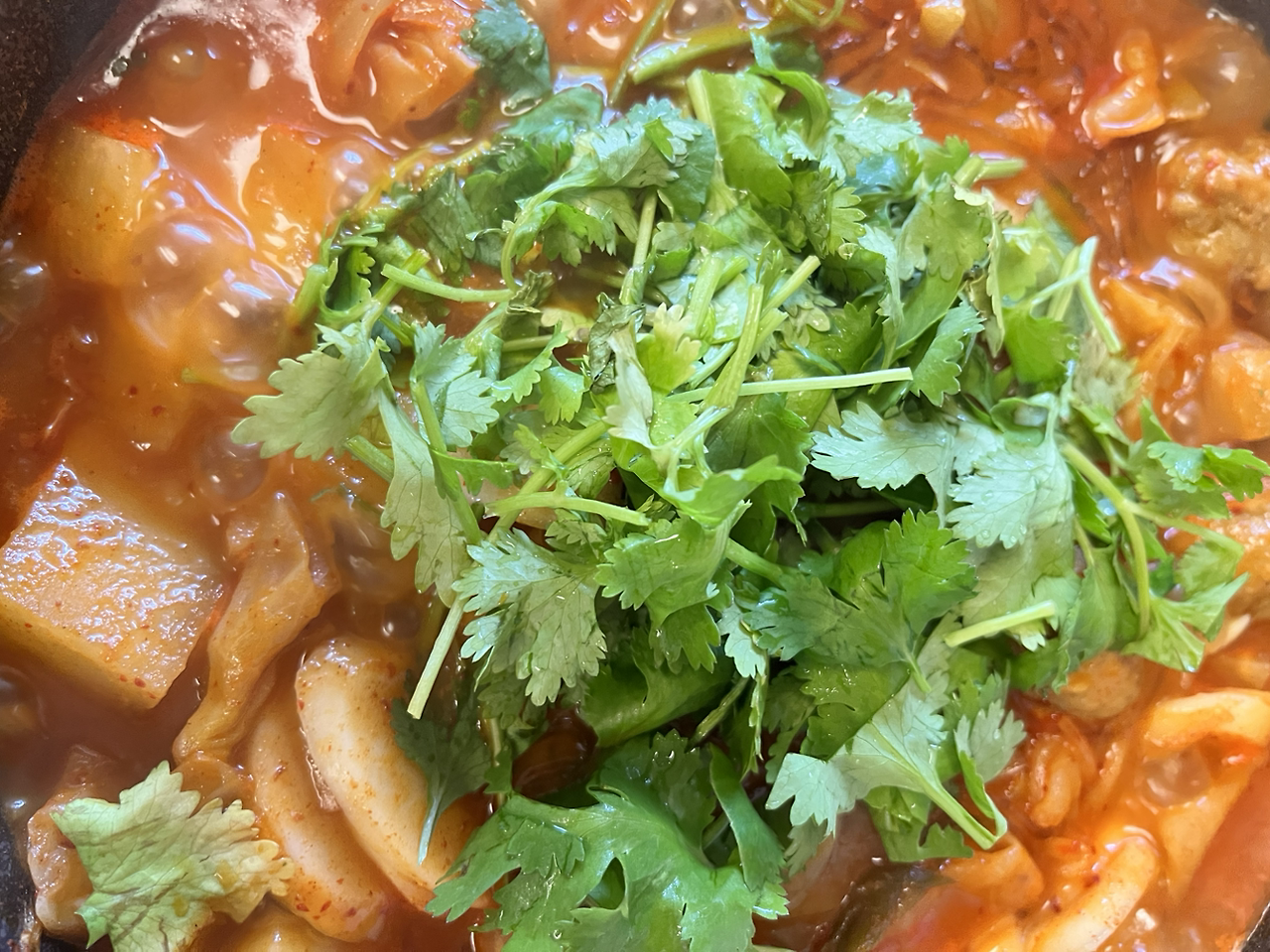 떡국떡울 조금 넣었어요. 그래도 떡뽁이인데….. 고수를 곁들여 드시면 맛이 좋습니다.