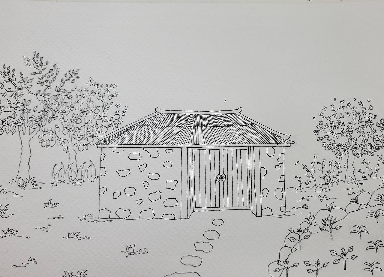 '아직 많이 부족한 것 같은데 과연 잘 그릴 수 있을까?' 하는 의구심이 들었지만 용기를 내어 하얀 캔버스에 펜으로 그림을 조심스레 그려나갔다. 공방 맞은편 작은 돌담과 집을 시작으로 펜 드로잉 작업이 시작되었다.