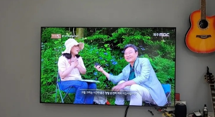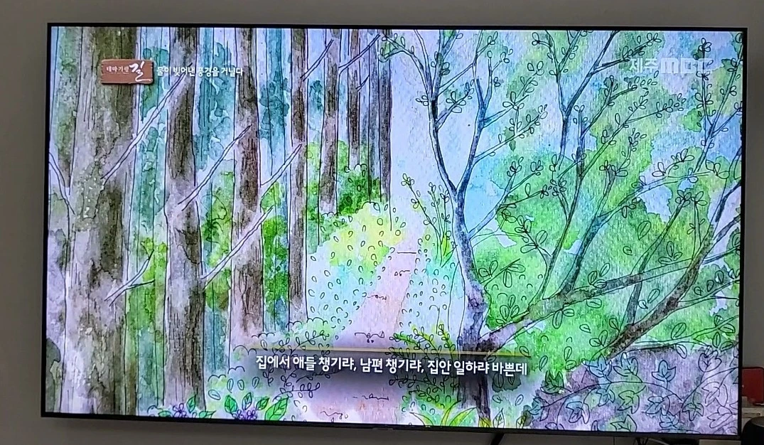 드디어 7월 16일 토요일 오전, 내 모습이 TV 화면에 방영되었다. 설렘 반, 떨림반으로 거실에 아이들과 모여 앉아 방송시간을 기다렸다. 광고가 끝나고 "물이 빚어낸 풍경을 거닐다" 주제로 최주봉 리포터의 등장과 함께 방송이 송출되었다. 한라산이 품어 안은 초록빛 싱그러운 생명의 땅, 곶자왈 소개로 방송이 시작되었다. 곶자왈, 삼다수 숲길의 영상이 지나고, 어반 스케치하는 우리의 모습이 전파를 탔다.