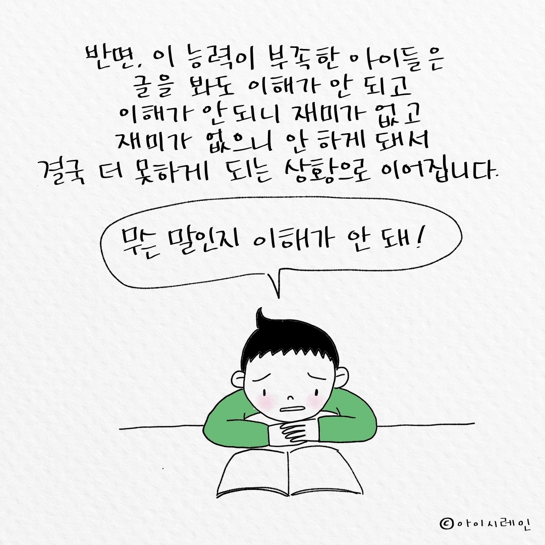 반면, 이 능력이 부족한 아이들은 글을 봐도 이해가 안 되고, 이해가 안 되니 재미가 없고, 재미가 없으니 안 하게 돼서 더 못하게 되는 상황으로 이어집니다.
