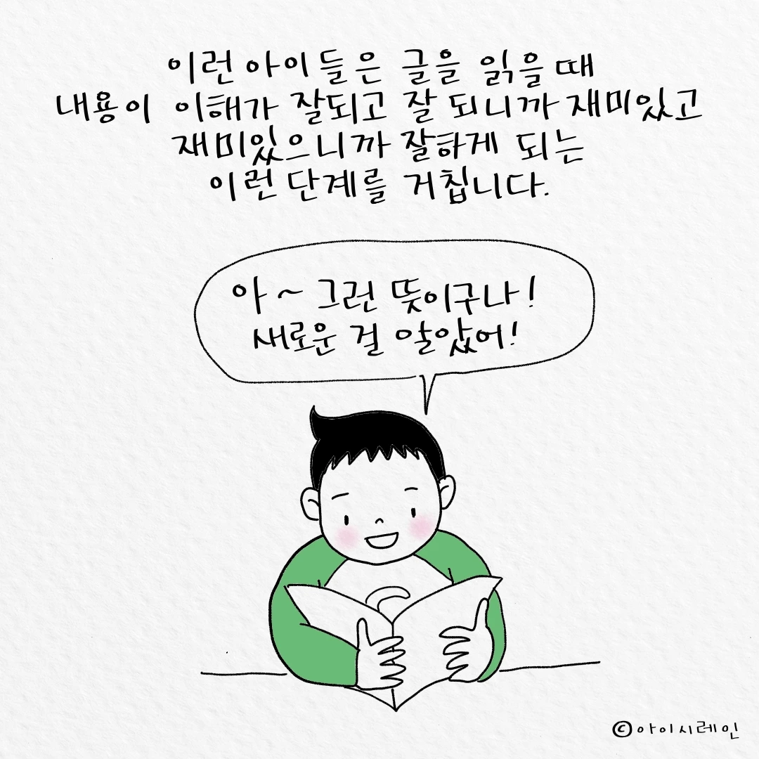 이런 아이들은 글을 읽을 때 내용이 이해가 잘되고, 이해가 잘 되니까 재미있고, 재미있으니까 잘하게 되는 이런 단계를 거칩니다.