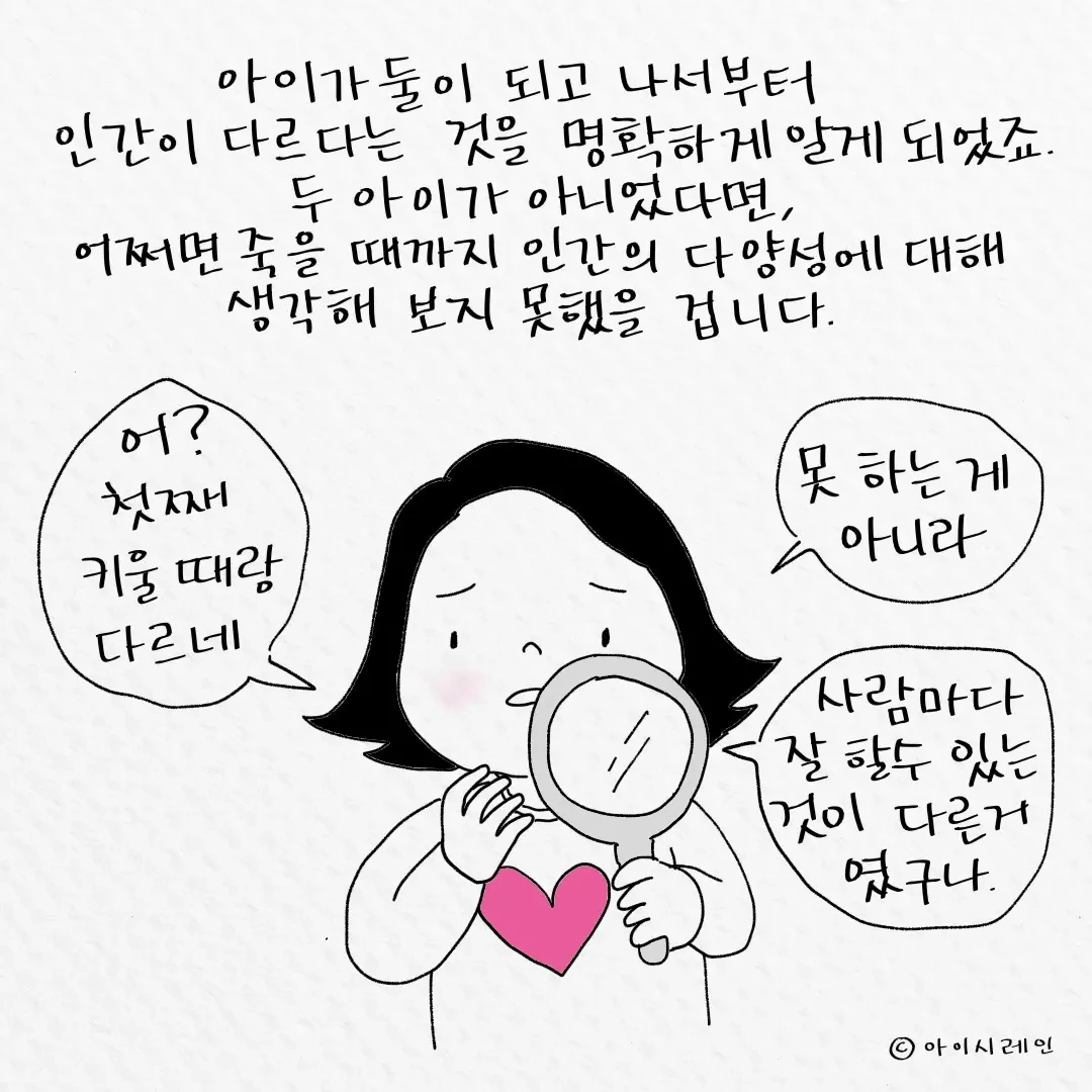 비교하면서 아이의 단점을 바라보기보다 두 아이가 달라서 가진 장점을 찾아보세요.