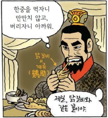 삼국지에 나오는 이야기이다. 한중이라는 지역은 천혜의 요새이다. 첩첩산중으로 이루어진 이 지역은 유비 입장에서도 조조 입장에서도 일단 가지고 있으면 여러모로 도움이 되는 지역이다. 둘 다 그 사실을 알기에 서로 물러서지 않고 치열한 전쟁을 치렀다. 하지만 유비의 강한 장수들과 제갈량의 신묘한 계책으로 전세는 점점 유비 쪽으로 기울기 시작했다. 심지어 조조가 아끼는 장수인 조인이 이 전투에서 사망하면서 조조는 과연 이 전쟁을 계속해야 할지 말아야 할지 깊은 고민에 빠진다.