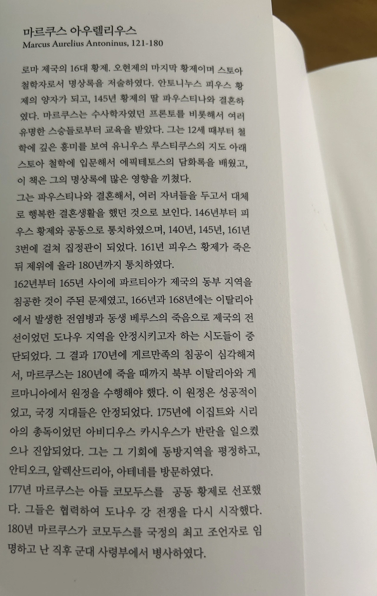 명상록은 기승전결이 없다. 들고 다니다가 한 번씩 꺼내 읽어보자. 앞의 내용이 기억이 안나도 전혀 상관없다.