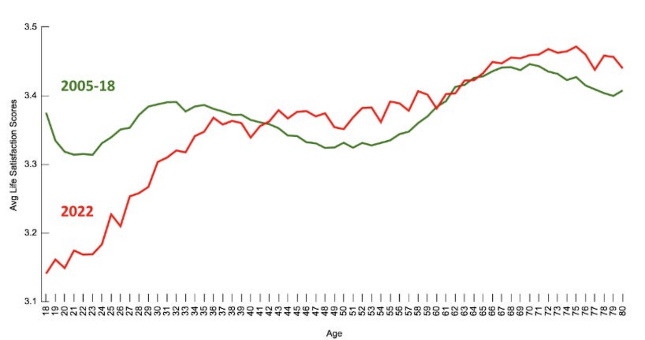 하지만 이 그래프의 변화를 미국의 경제학자 대니 블랜치플라워가 'The Global Loss of the U-Shaped Curve of Happiness'이라는 칼럼과 함께 공개했습니다. 2022년의 조사에 따르면 오히려 1~20대는 전체 연령에서 가장 불행한 연령대로 집계되었습니다.