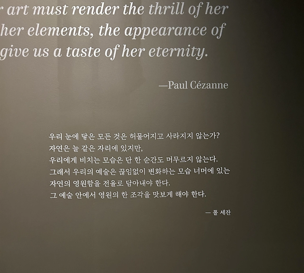 저는 제게 친숙한 언어로 재창조된 문장에 스스로 만족해하고 있었습니다. 그러다 보니 허리의 통증이 좀 가신 것 같아, 마저 전시를 관람했습니다. 집에 돌아와서 전시회에서 찍은 사진들을 둘러보니, 폴 세잔의 글을 찍은 사진도 있었습니다. 그 사진을 보고 제 눈은 폴 세잔의 언어로 적힌 글을 읽어 내려갔지만, 제 머릿속에서는